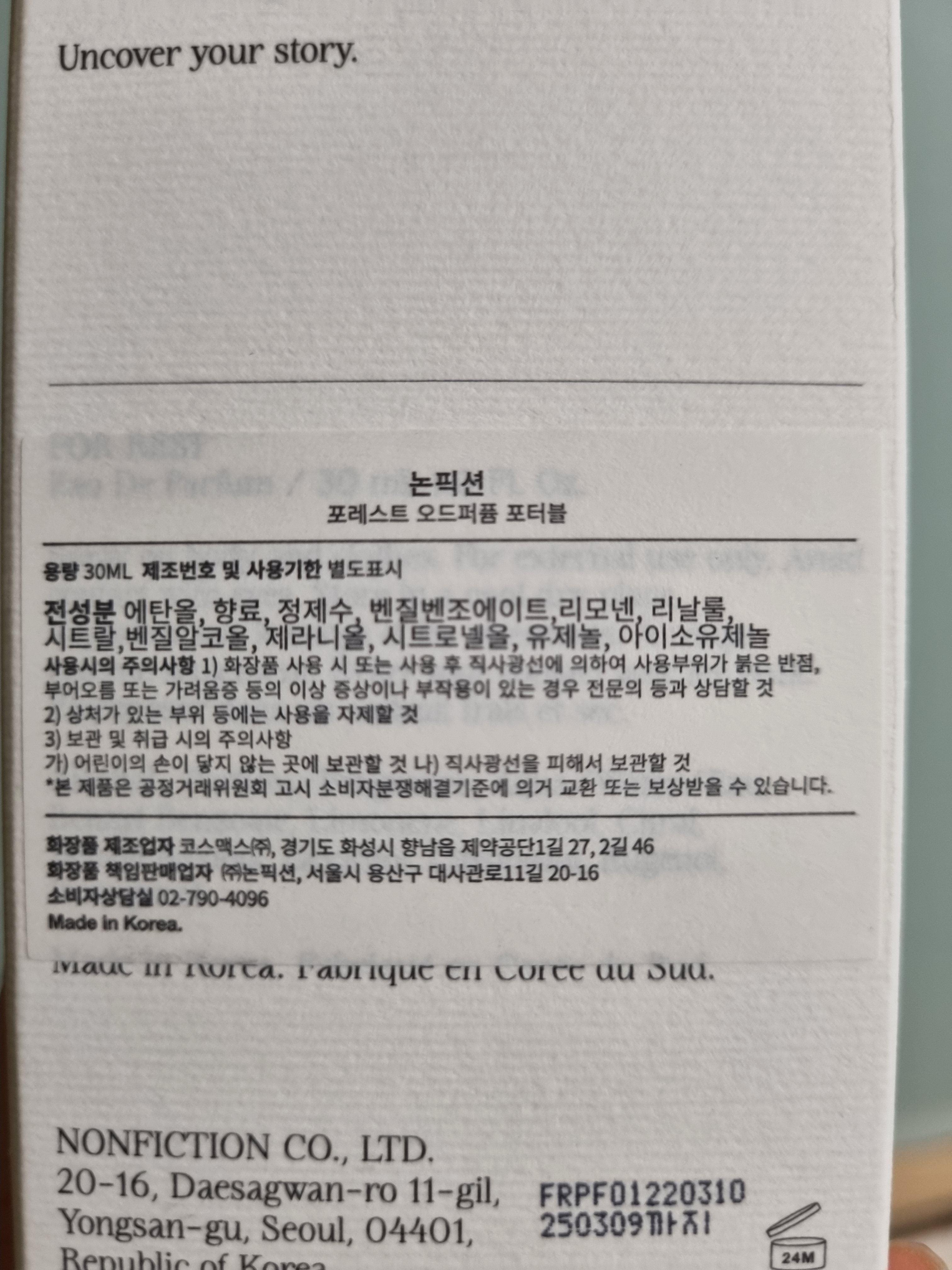 아래는 논픽션 포 레스트 향수의 전성분 표기입니다. 참고하세요.