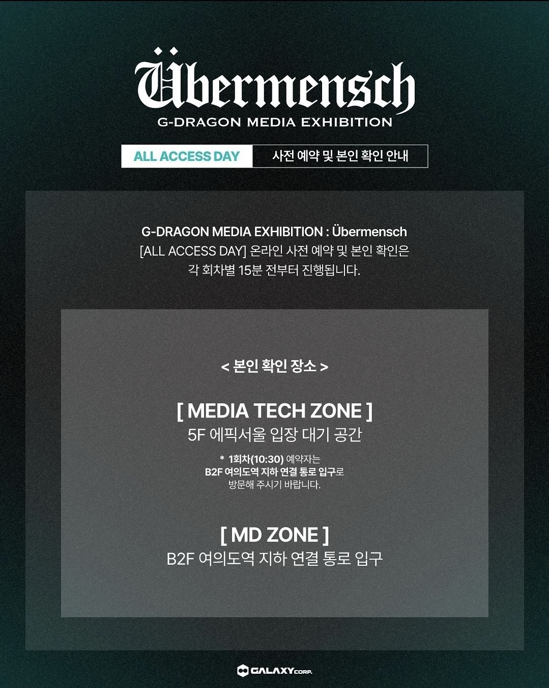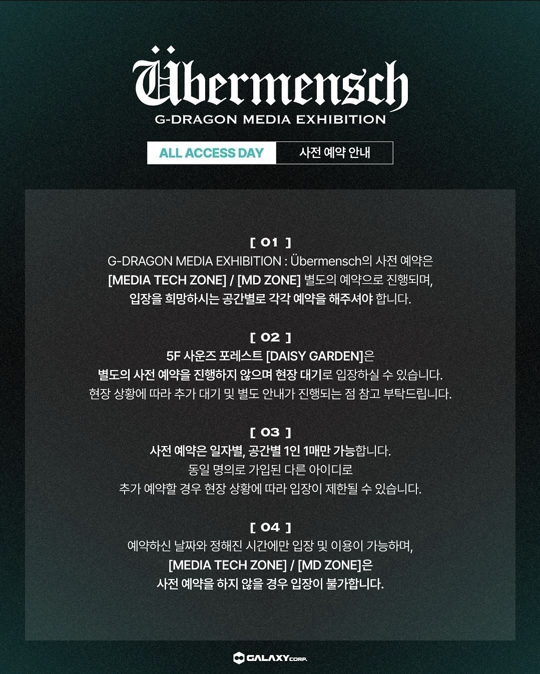이번 전시는 지드래곤이 11년 5개월만에 발매한 세번째 정규앨범을 관통하는 '위버맨쉬'의 메시지를 담아 디지털 미디어 아트 형태로 꾸며져 있습니다.