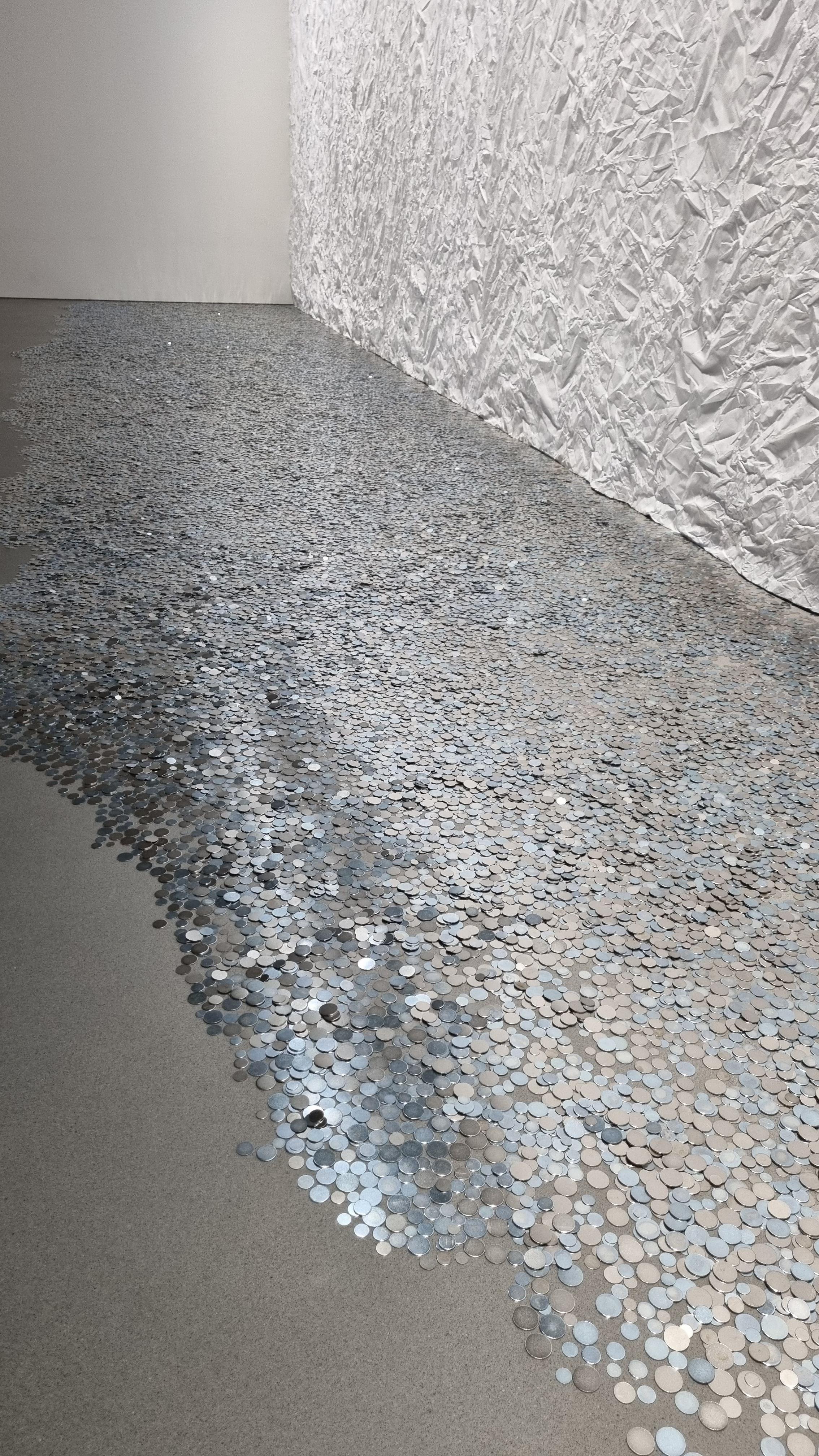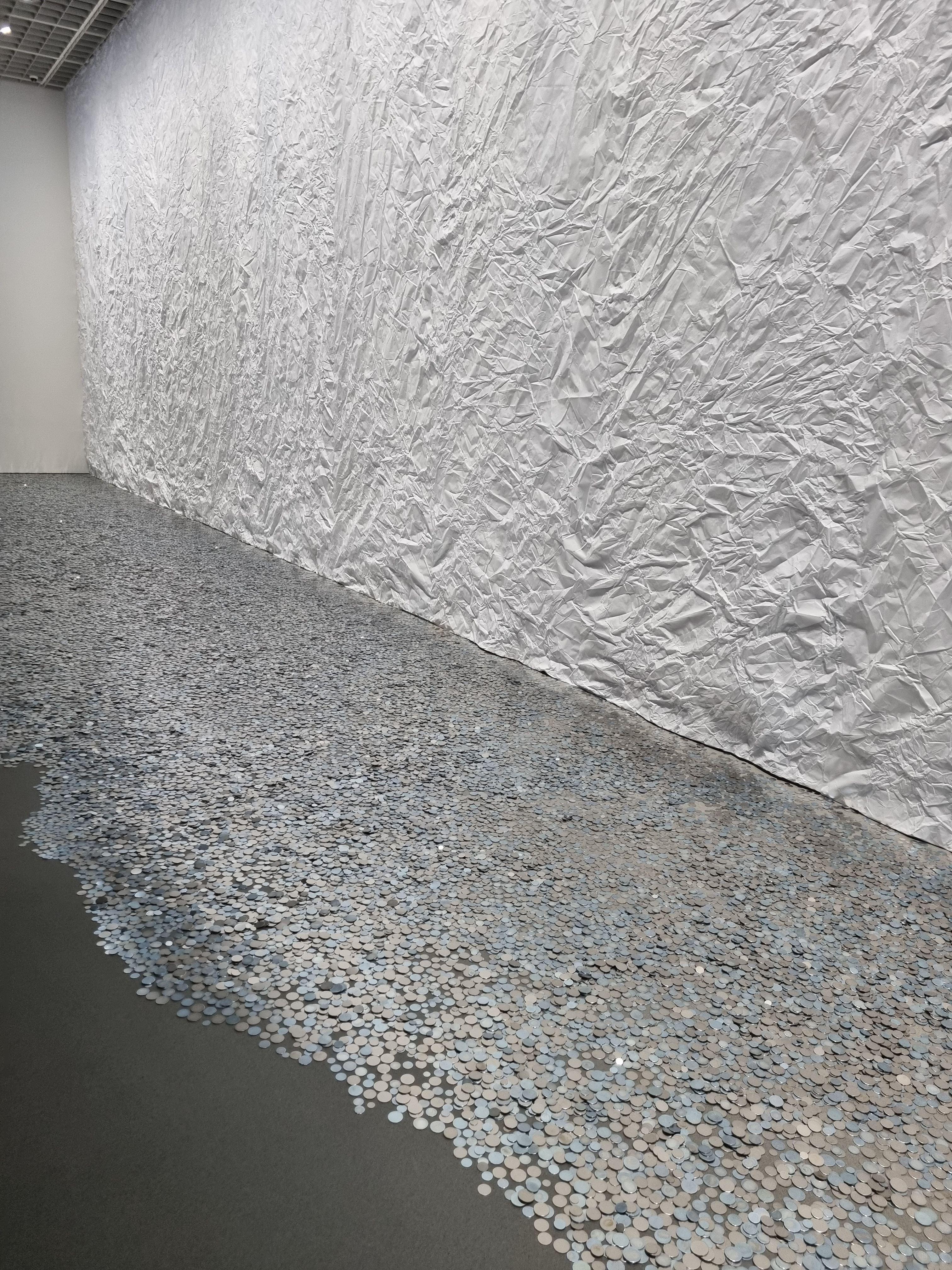 전시장의 한 벽면을 구겨진 흰 종이로 다 덮고 아래로 동전같은 금속조각들이 쏟아지는 것처럼 보였어요.