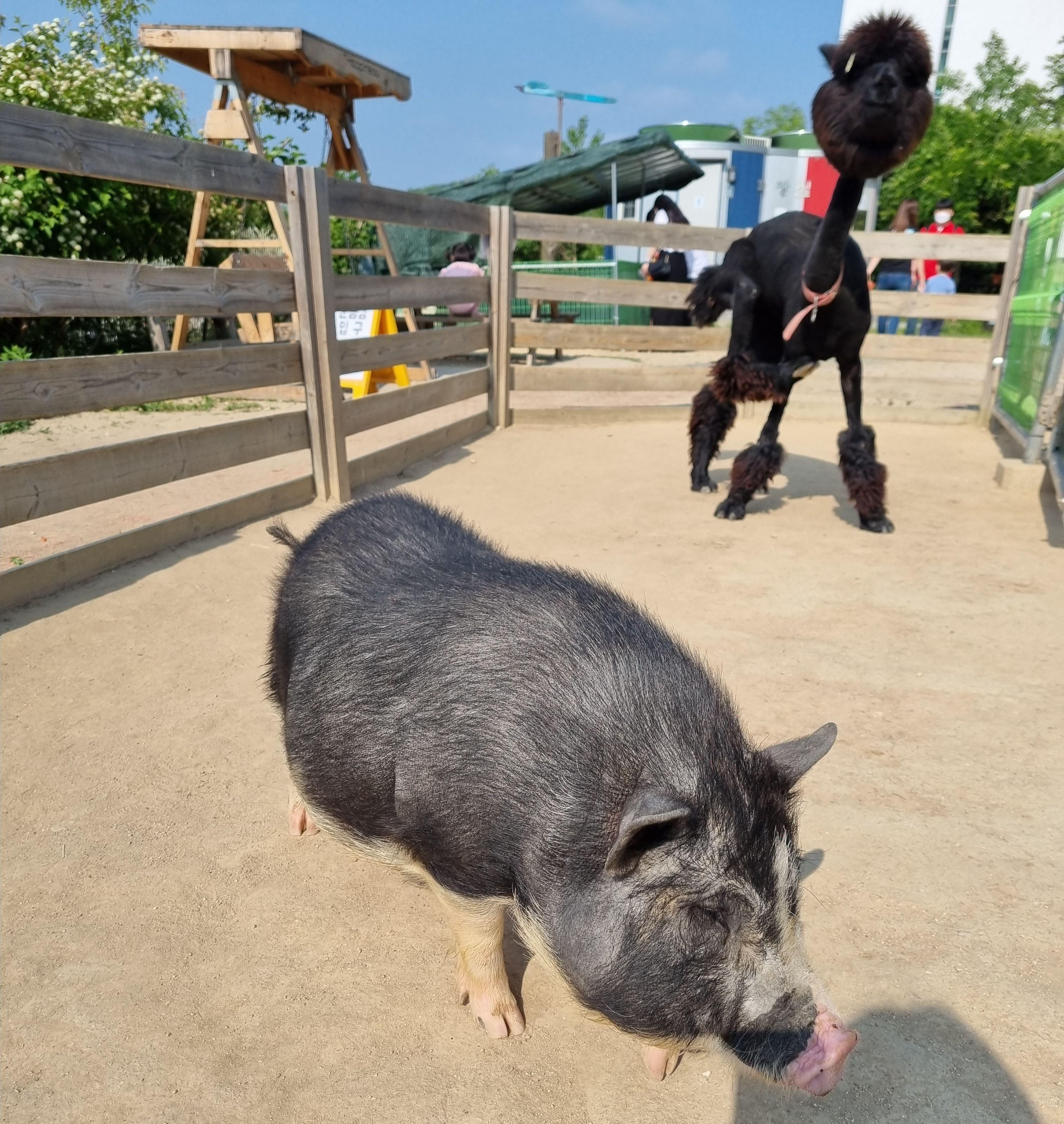 강화 프렌쥬랜드 먹이주기체험에는 누렁이 알파카와 검정털의 알파카, 돼지, 염소, 살찐 골드리트리버 개도 있었습니다.