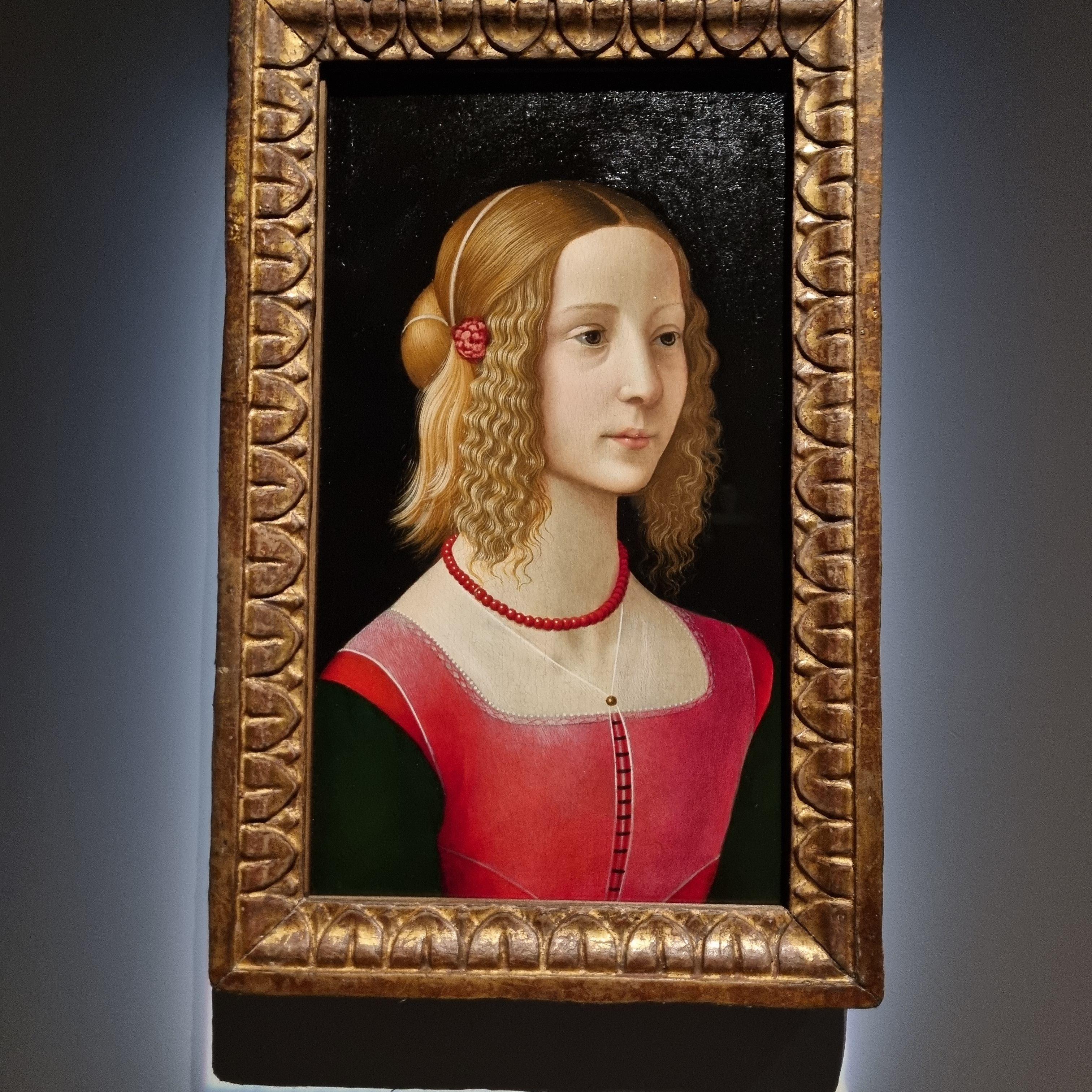 새틴 드레스의 화려한 다홍색과 치마의 체크무늬, 드레스의 꼬임장식과 세로트임은 그 당시 유행했던 스타일로, 모로니는 유화 기법을 활용하여 질감을 잘 표현했습니다.
