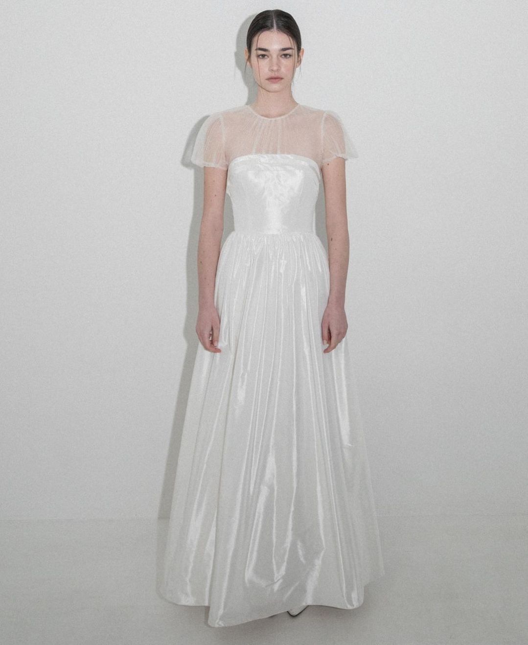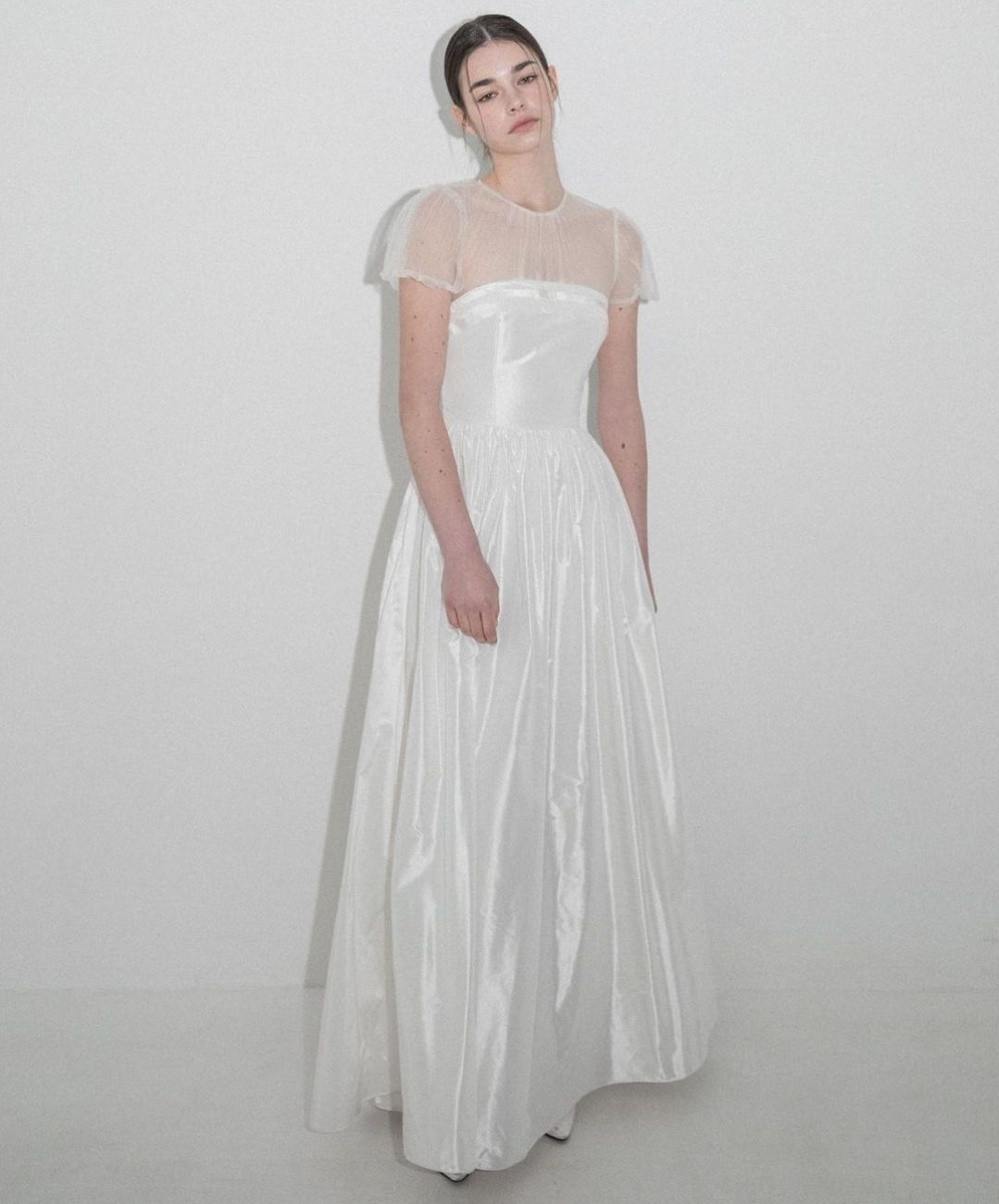 드레스는 종이처럼 구겨진 질감이 특징인 타프타실크로 만들어졌고, 상체부분은 짧은 퍼프소매디테일이 사랑스러운 튤로 제작되었습니다.