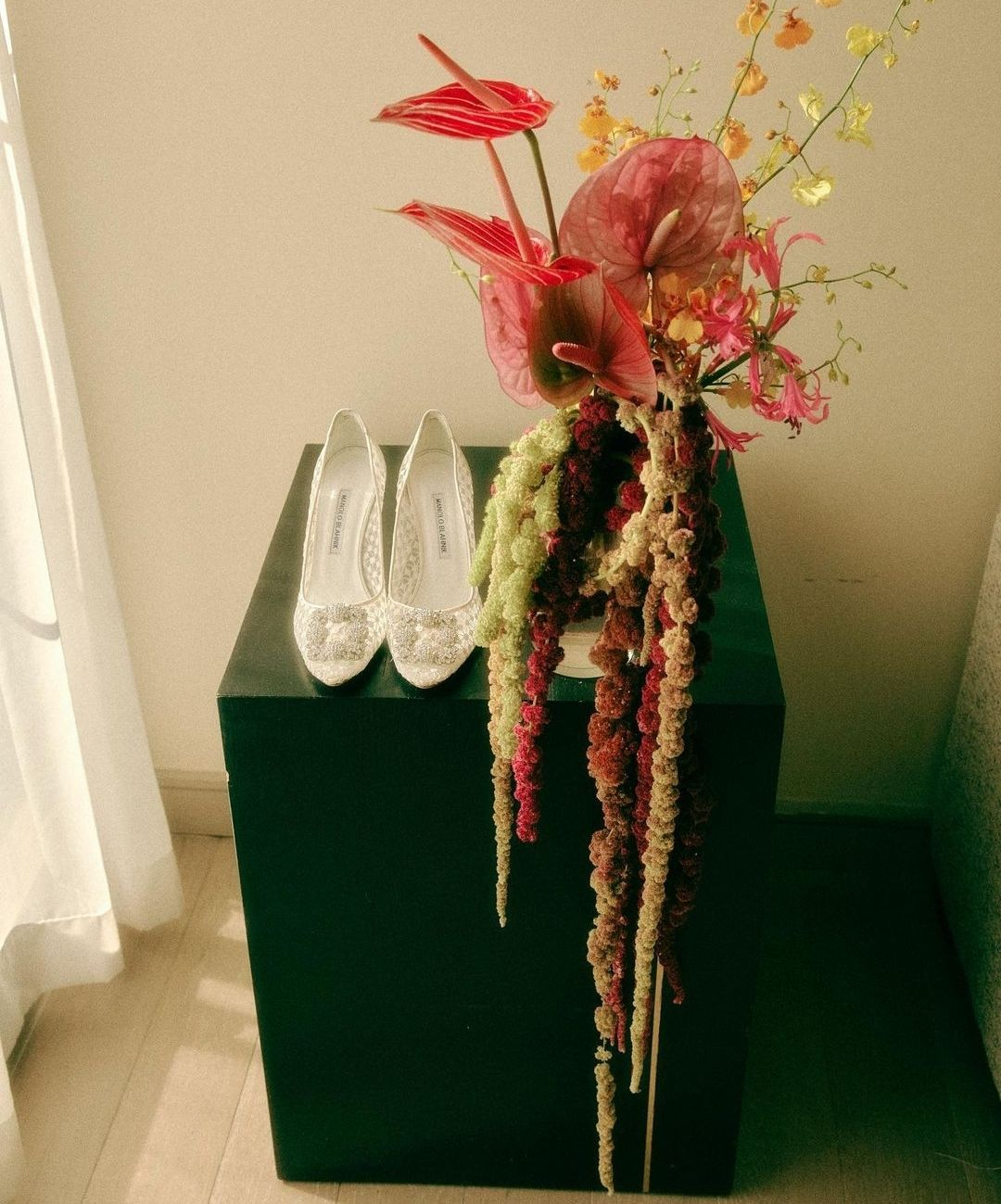 공효진이 빨간 양말과 운동화를 벗고 웨딩드레스 안에 신을 구두는 예비신부들의 로망인 웨딩슈즈 브랜드 마놀로블라닉 레이스구두인 것로 보입니다.