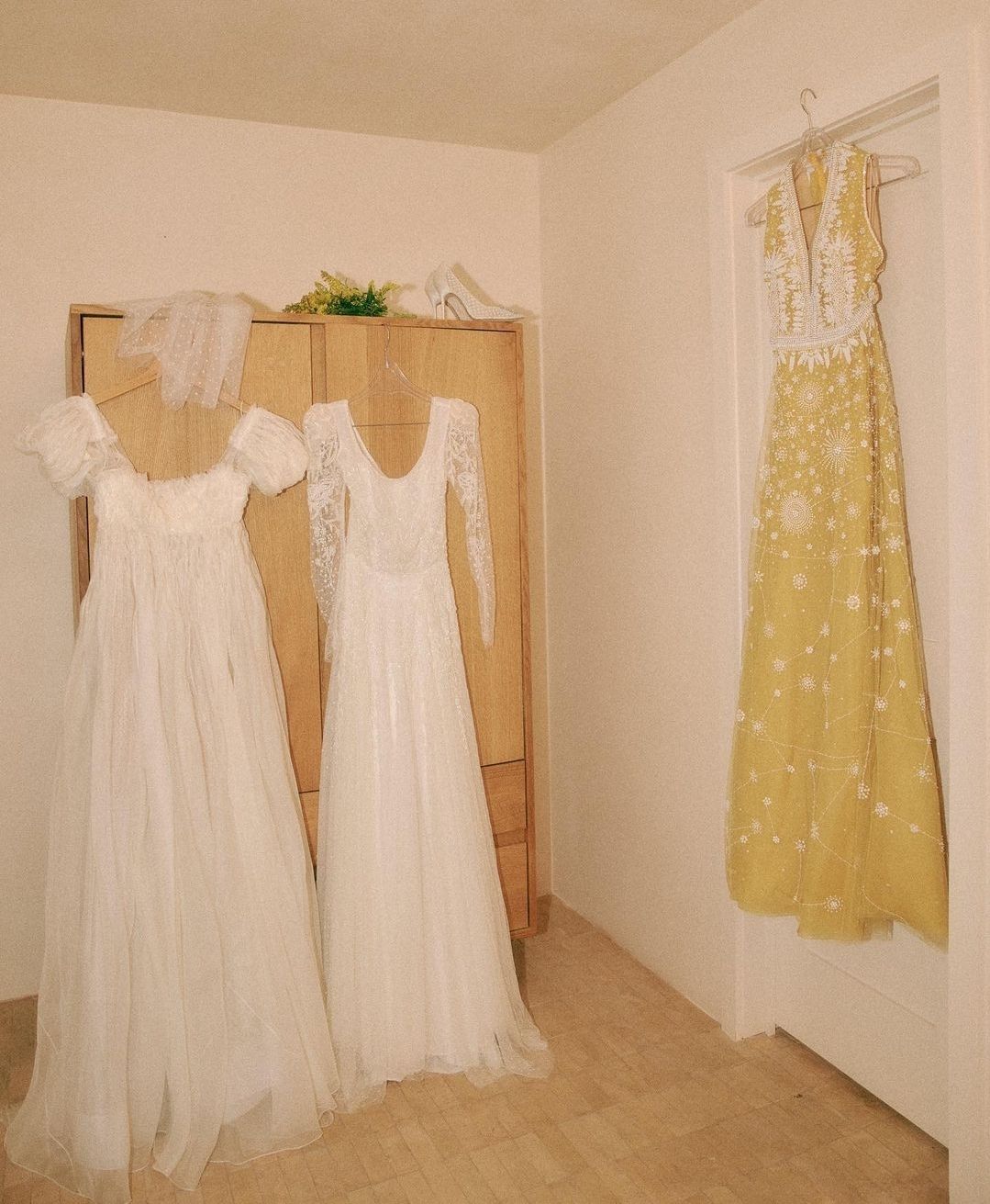 웨딩데이날 공효진이 입은 웨딩드레스는 총 세벌로, 화이트드레스가 두벌, 노란컬러의 드레스가 한벌이었습니다.