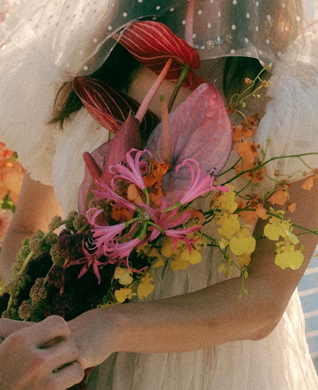 공효진이 든 부케도 트로피컬 느낌이 물씬 나는데 순백색의 드레스와 너무 잘 어울립니다.