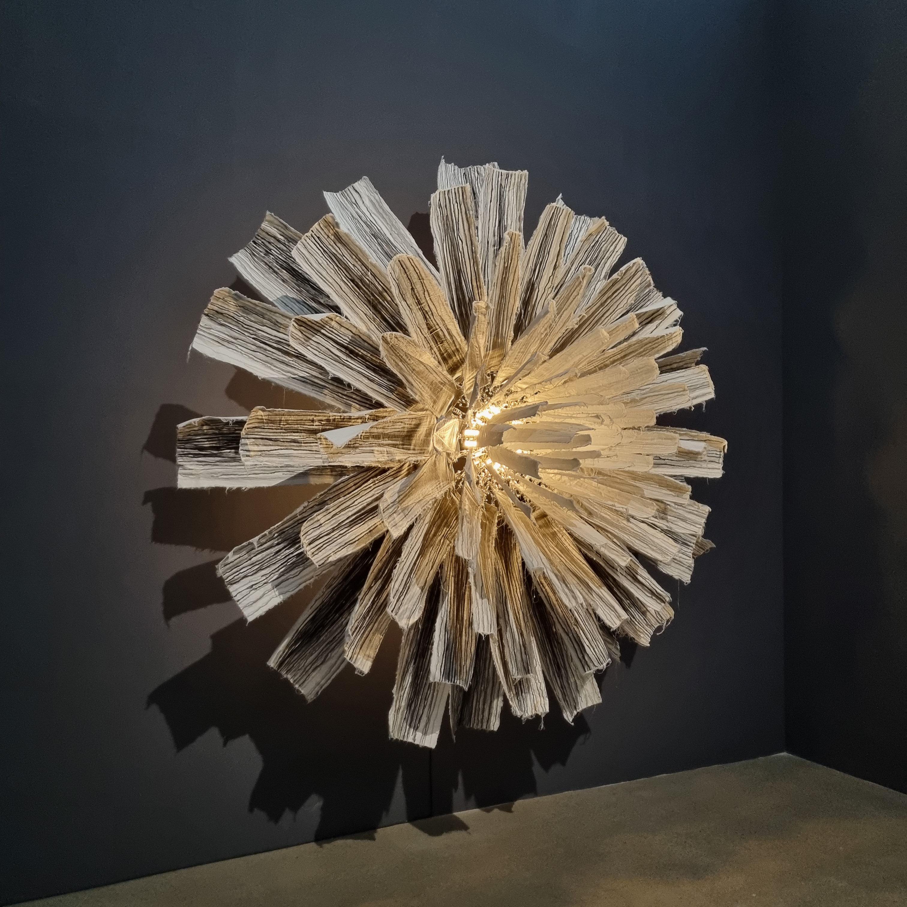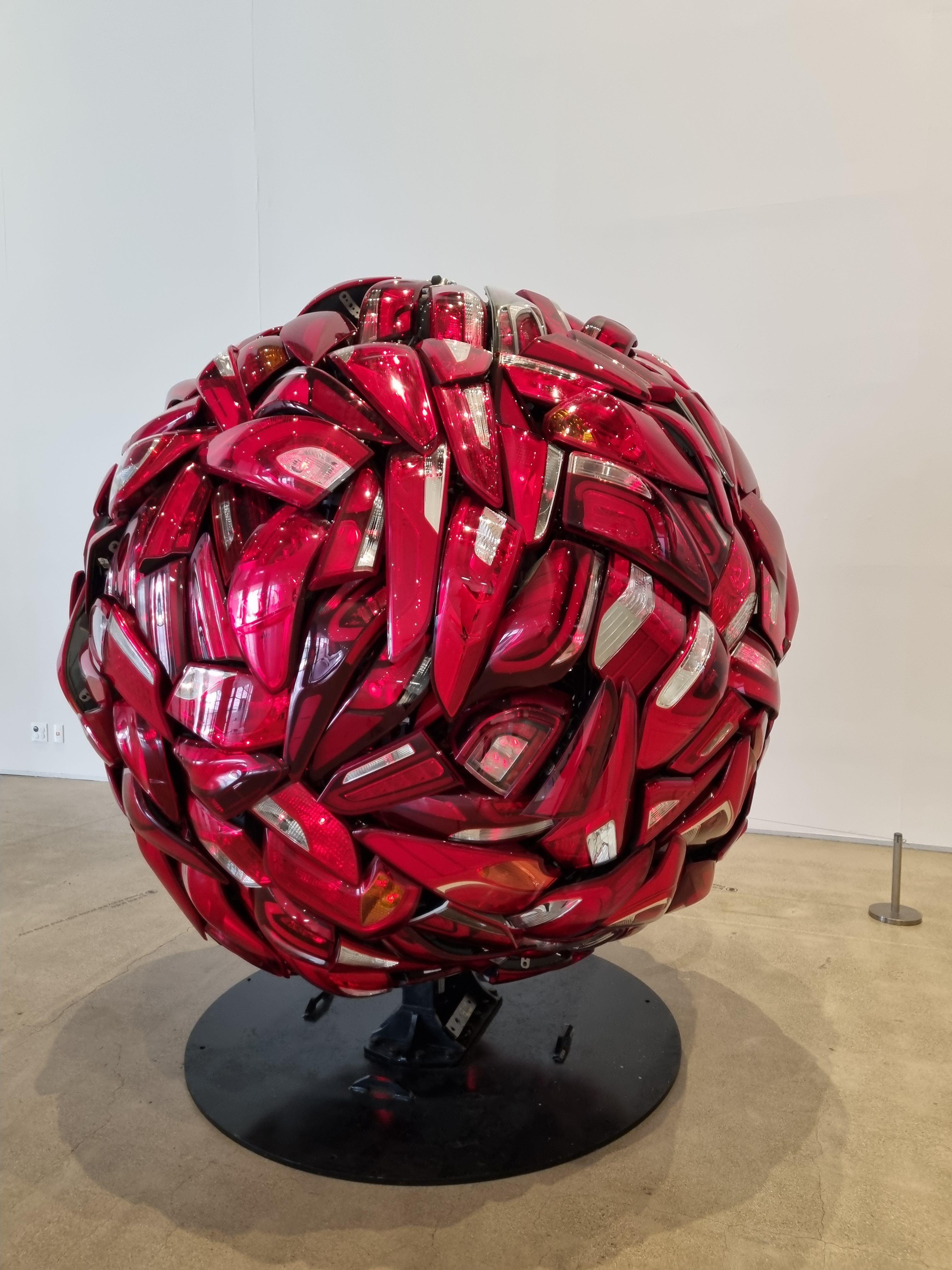 그리고 전시장 복도에 설치된 원형 조각 두 작품이 보이는데요, 이 작품들은 폐차 직전 자동차에서 분해한 전조등과 후미등을 모아 원형의 별로 조립한 것으로