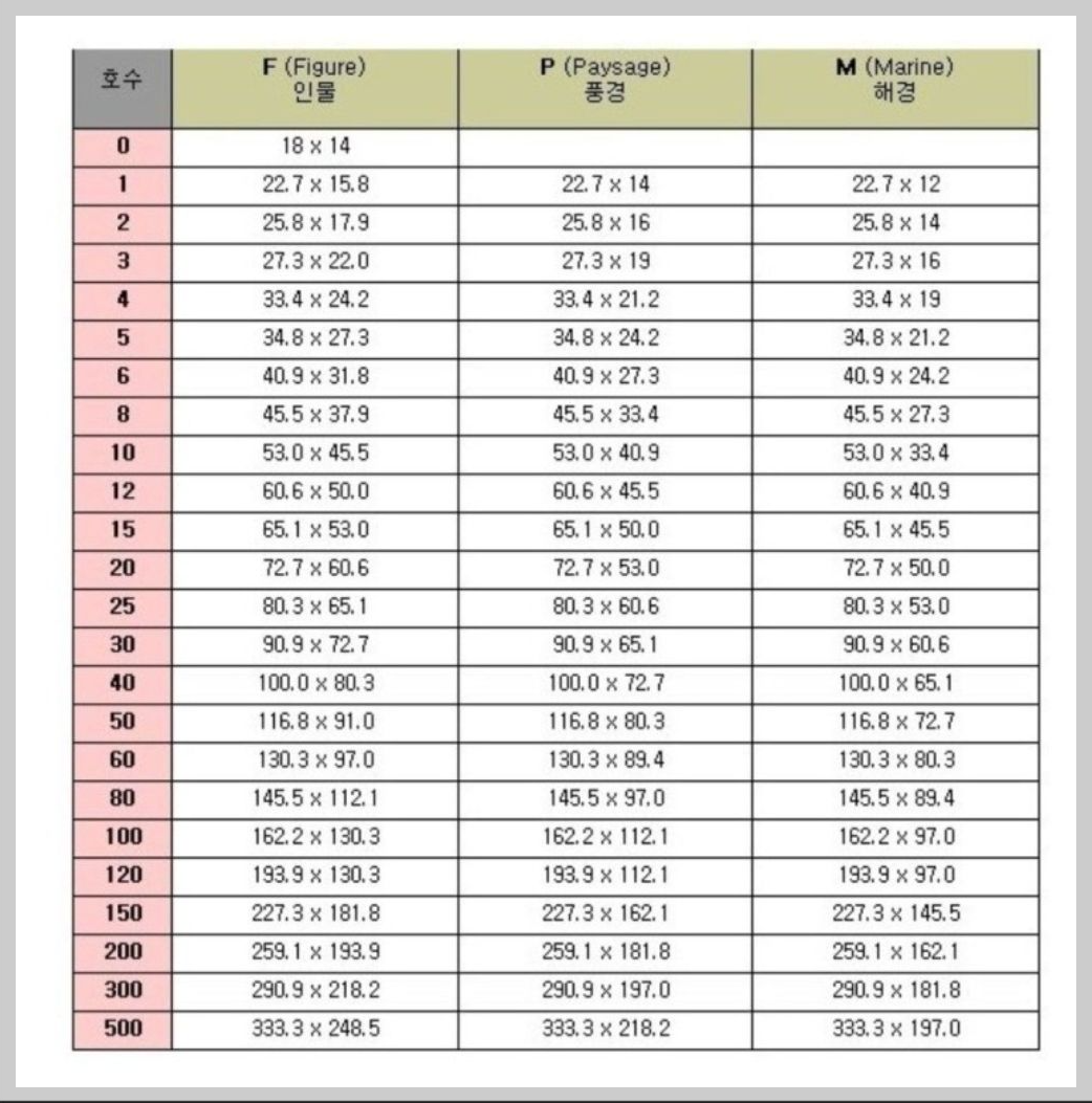 가장 선호하는 사이즈 10호, 20호, 30호 정도의 그림 호수는 알고 계시면 좋을 것 같고 왼쪽에 F(인물)의 사이즈가 대체적으로 통하는 호수이니 그것만 아셔도 될 것 같습니다.