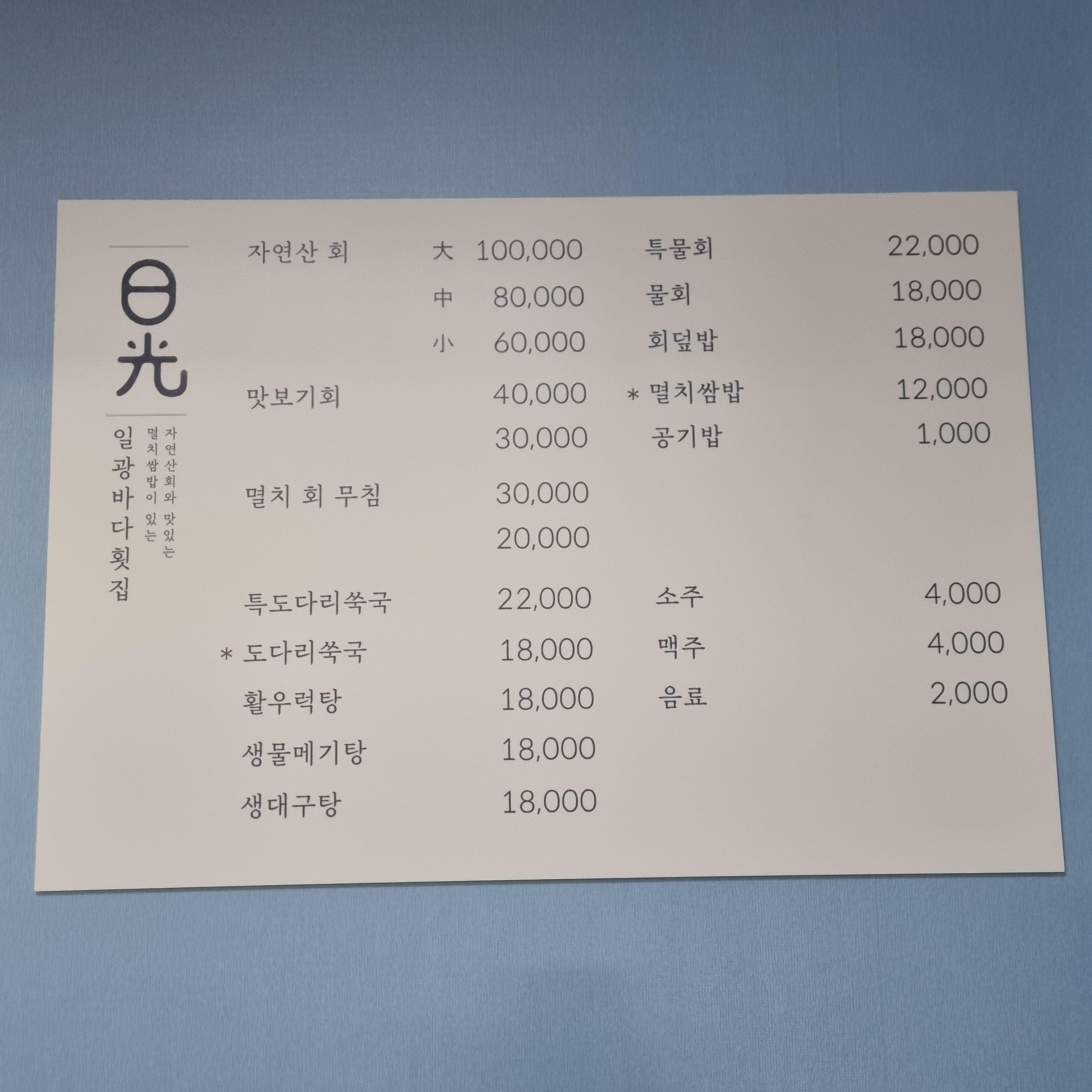 멸치쌈밥 12,000원/ 자연산 회 60,000~100,000