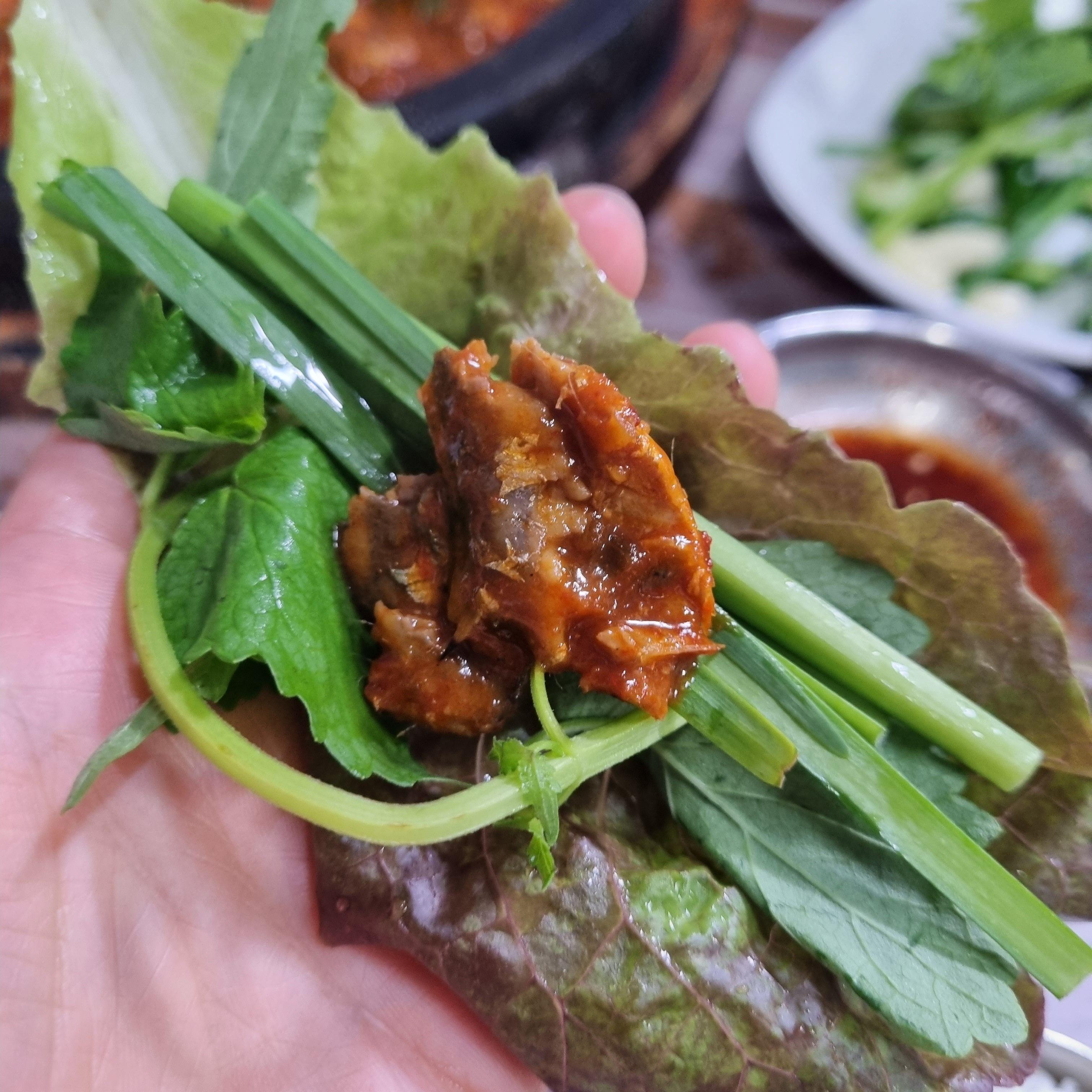 쌈에 멸치를 넣어 싸먹는데 너무 맛있었어요. 멸치쌈밥 태어나서 처음먹었는데 딱 맛있는 고등어조림맛이었습니다.