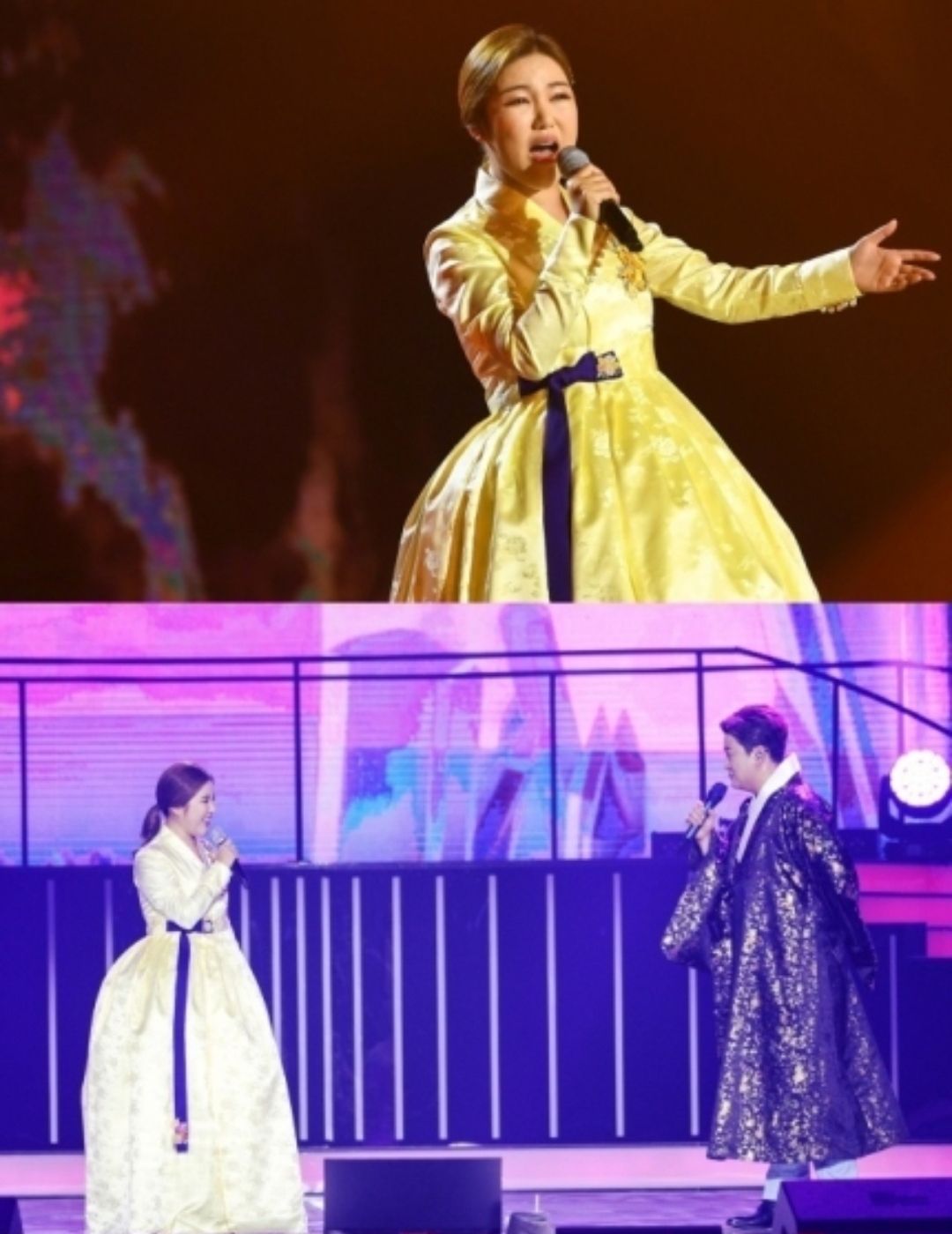 송가인도 김호중과 첫 듀엣 무대를 완성했는데요, 곱게 한복을 차려입은 송가인은 '비 내리는 금강산' 무대로 국악의 진수를 보여줬습니다.