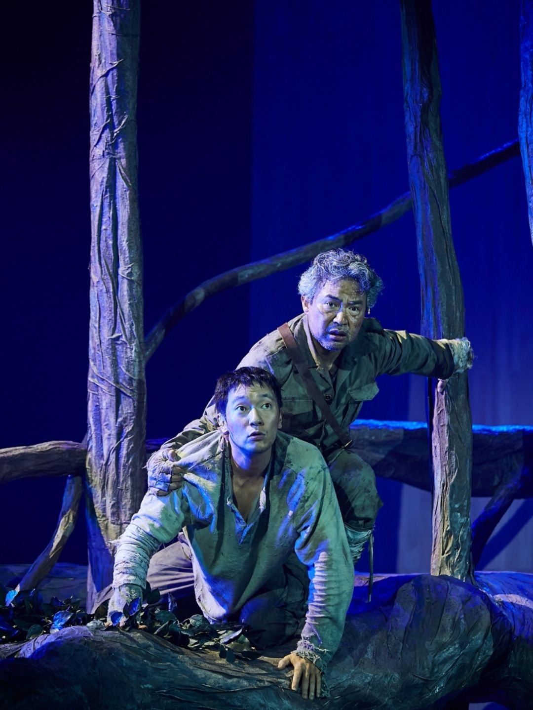 무대를 가득 채운 건 커다란 나무이고, 관객의 가시성을 위해 무성한 나뭇가지는 제거되고 단단하게 꼬인 나무줄기가 두 군인의 동선을 극대화시킵니다.