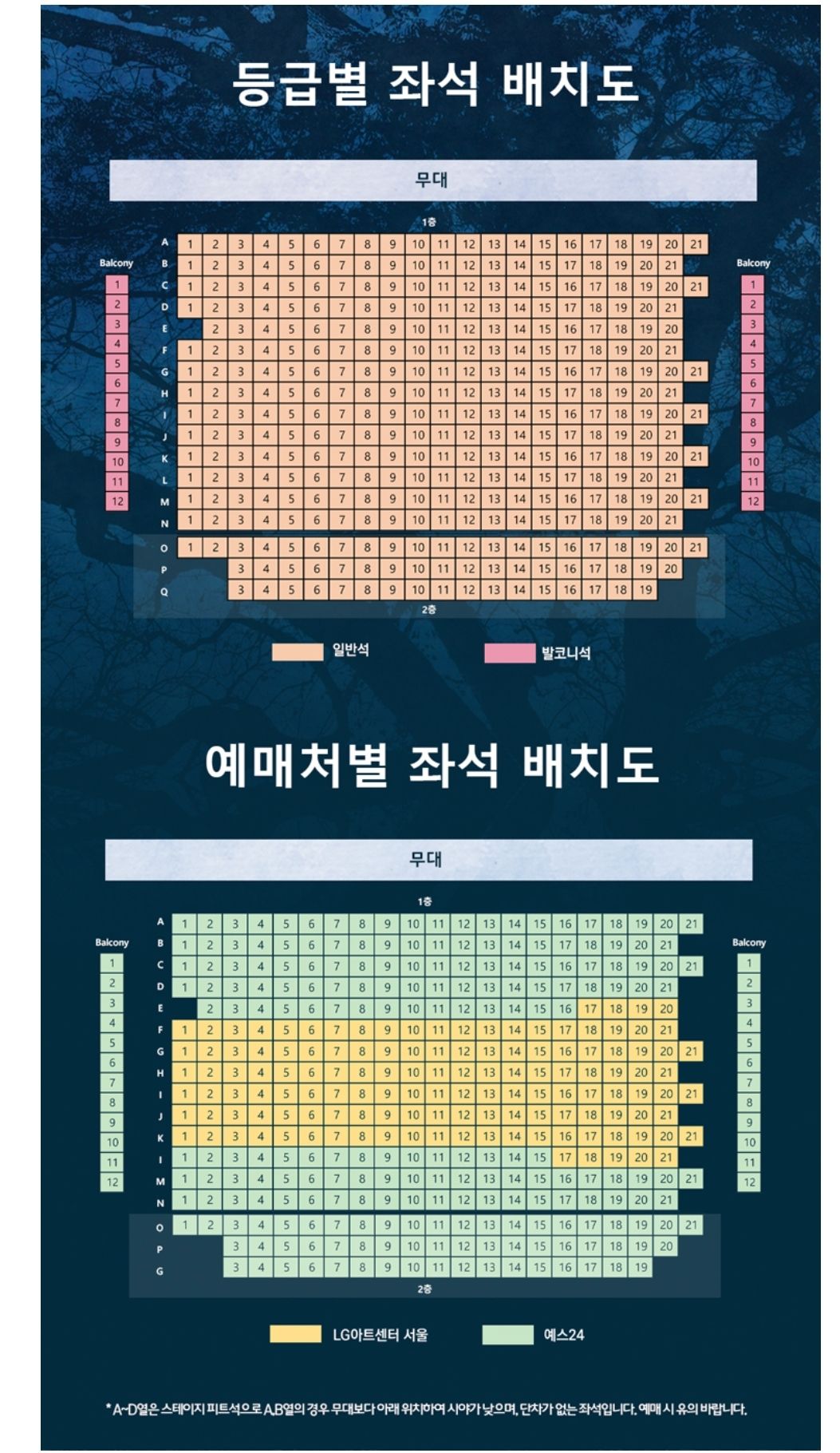 예매처는 LG아트센터와 예스24 두 군데인데, 두 군데의 좌석 배치도도 참고하시면서 예매하시면 좋겠습니다.