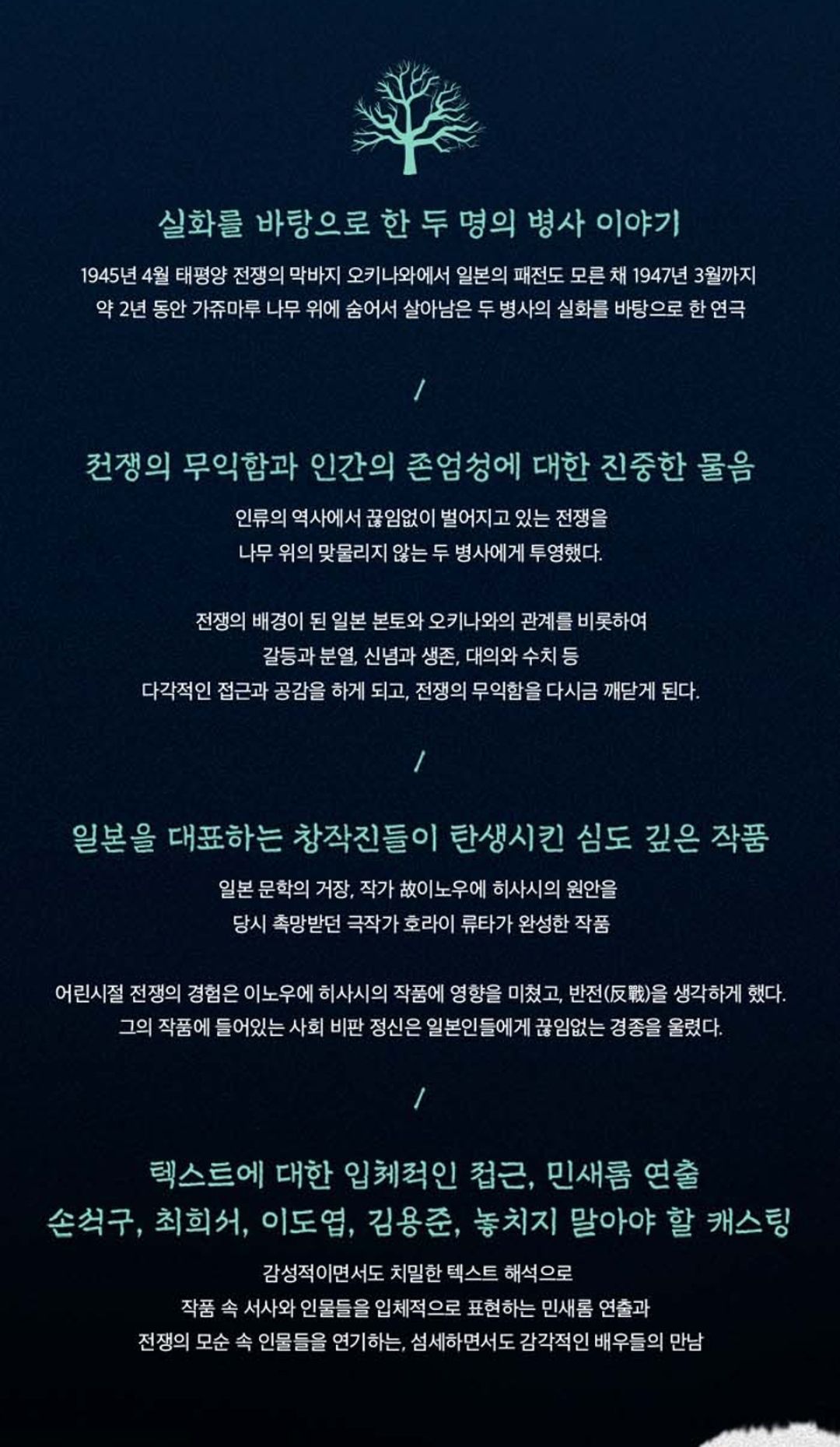 손석구배우가 출연해서 유명한 <나무위의 군대>연극은 태평양 전쟁의 막바지 오키나와에서 일본의 패전도 모른 채 1947년 3월까지 약 2년동안 가쥬마루 나무 위에 숨어서 살아남은 두 병사의 실화를 바탕으로 한 연극입니다.