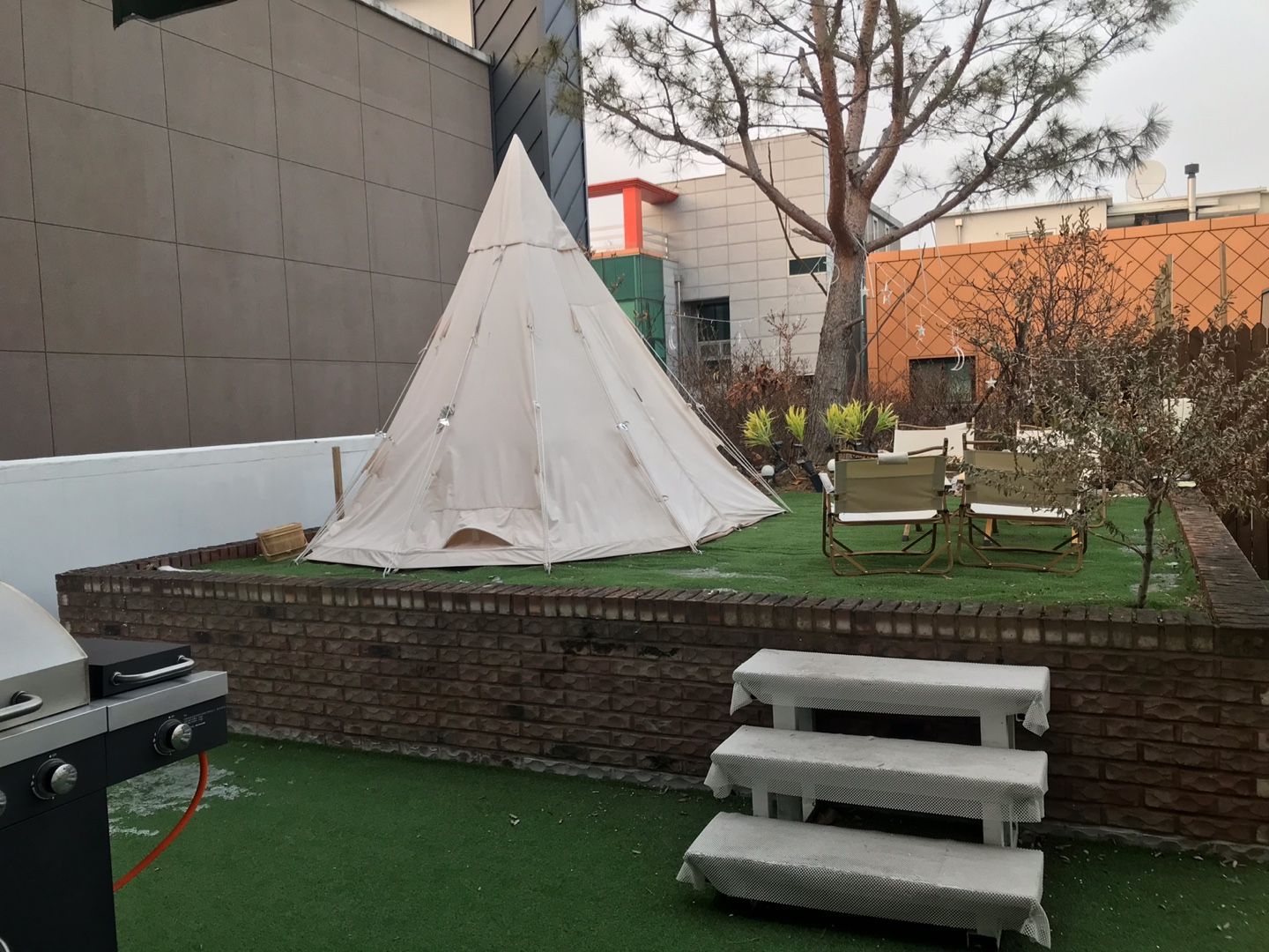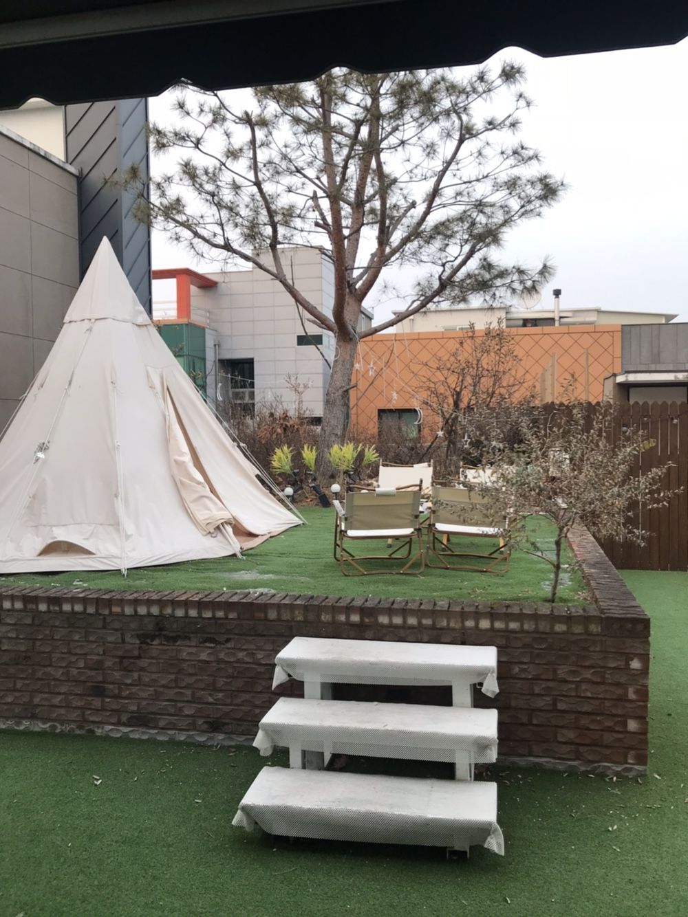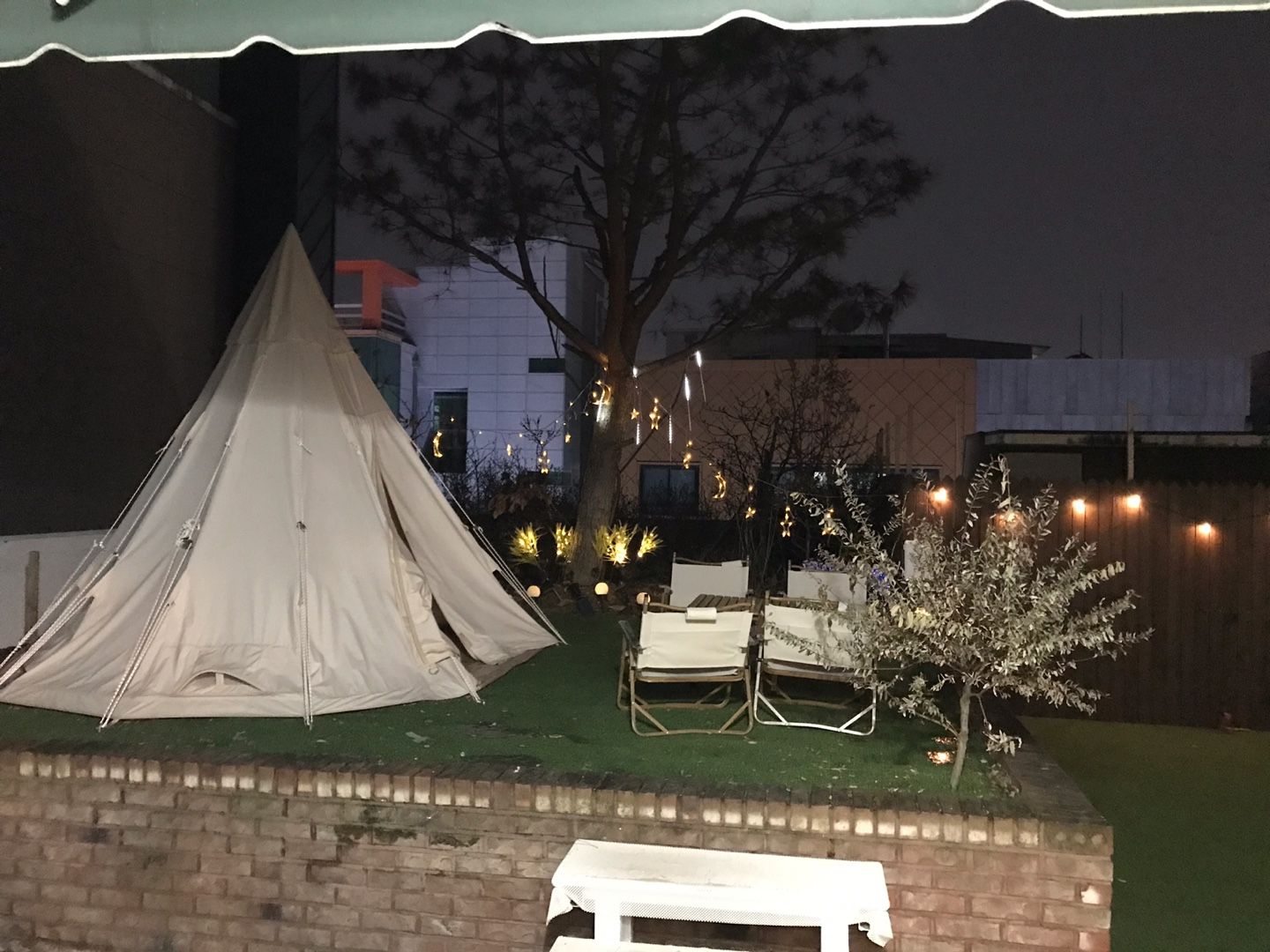 8인용 식탁이 있었고 옆에 캠핑포토존이 있는데 여긴 낮보다 밤에 더 예쁜 장소였어요~!