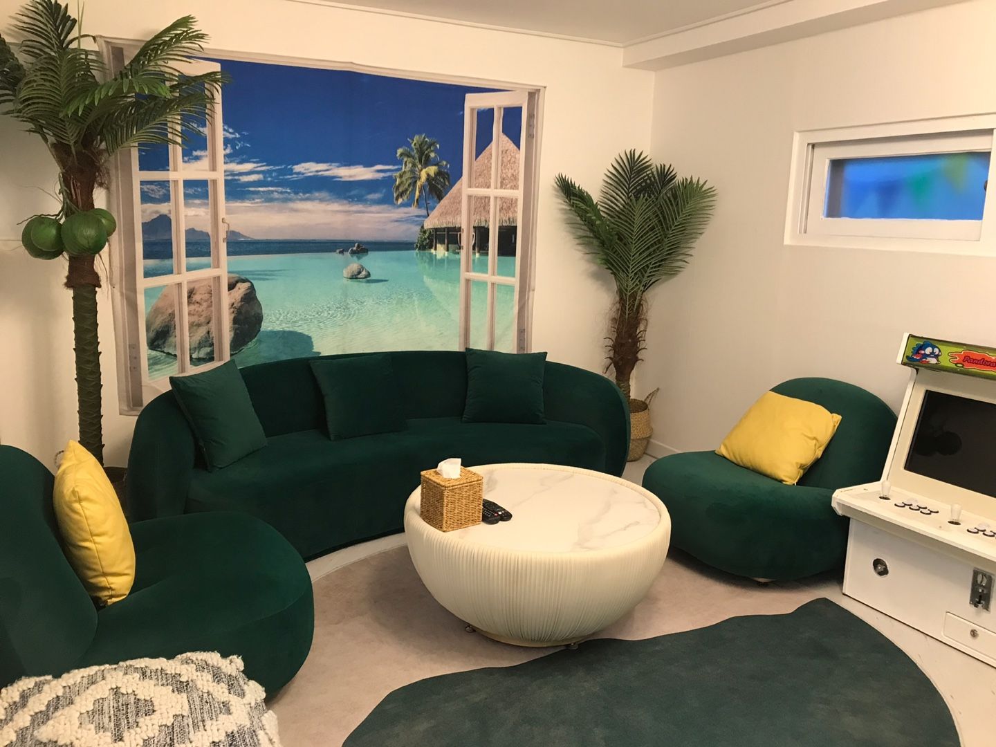 머나먼 휴양지에 있는 듯한 착각을 일으키는 사진앞에 넓은 쇼파