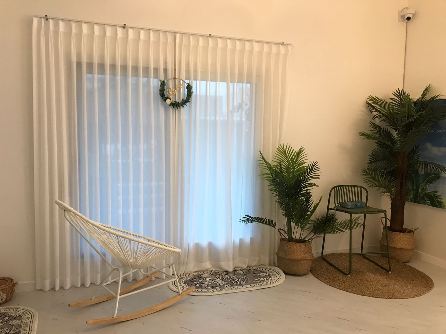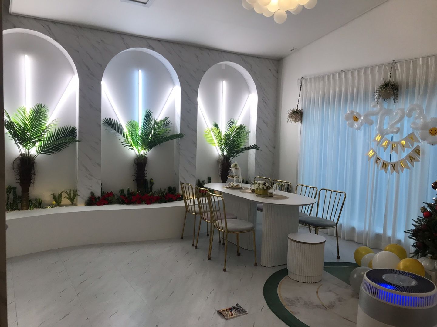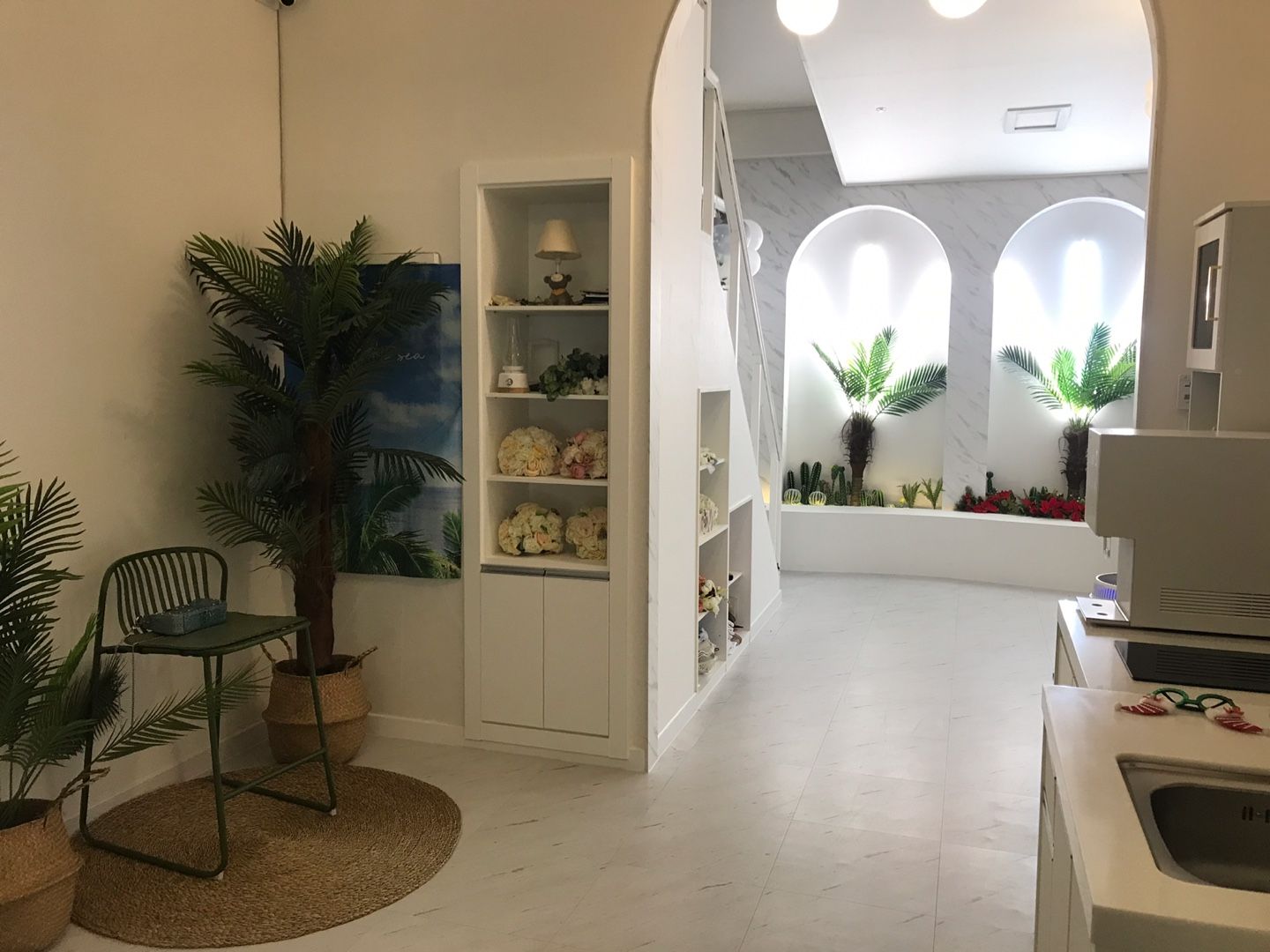입구에 들어서자마자 화이트톤으로 장식된 내부와, 조화지만 열대나무들이 곳곳에 있어서 휴양지로 놀러온 듯한 분위기를 주었어요.