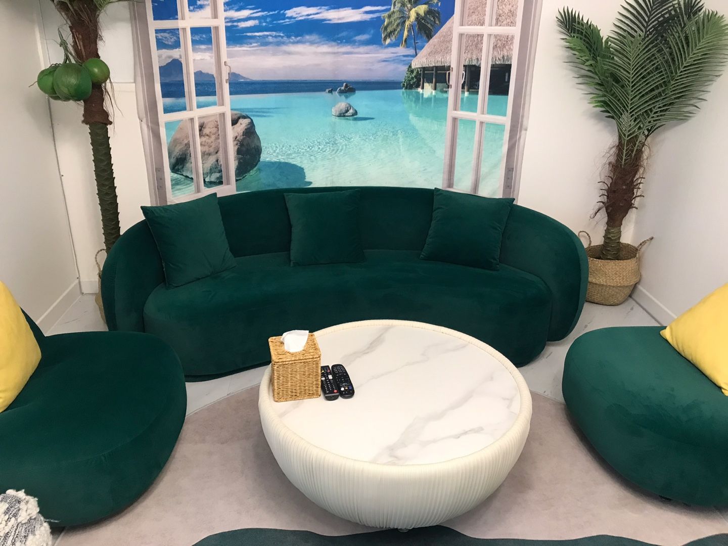 머나먼 휴양지에 있는 듯한 착각을 일으키는 사진앞에 넓은 쇼파