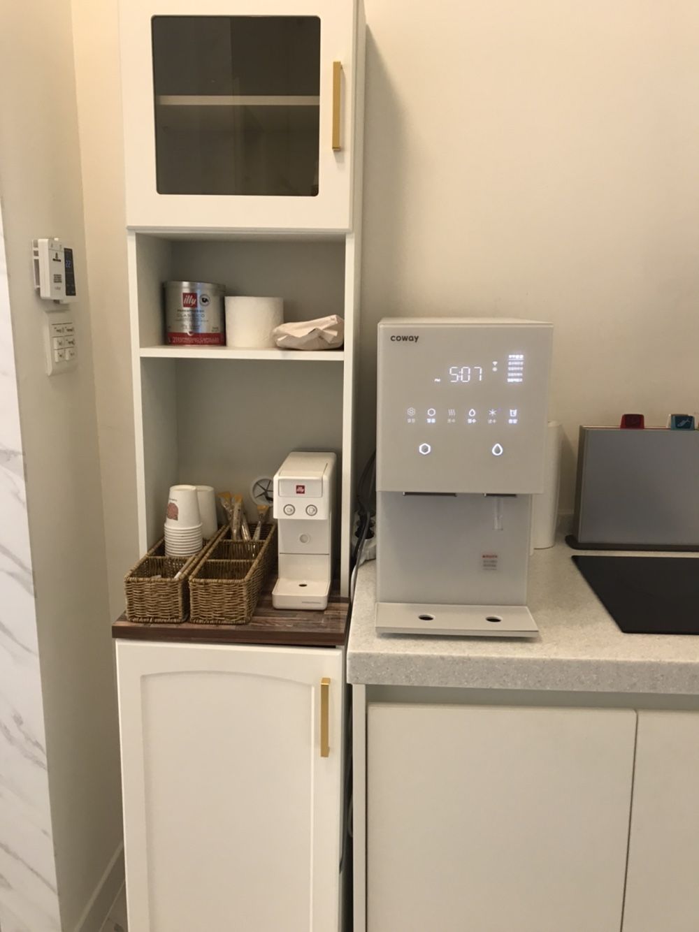 나미하우스에는 수건, 치약, 샴푸, 바디워시 등 다 구비되어 있구요, 냉장고, 전자렌지는 물론 얼음정수기와 일리 커피머신이 있어서 커피도 마시고 편했습니다.(인원수대로 캡슐제공)
