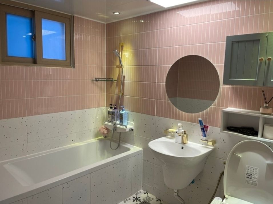 거울 옆에 화장실이 있는데 화장실도 핑크핑크하게 예쁘고 잘 꾸며놨더라구요.