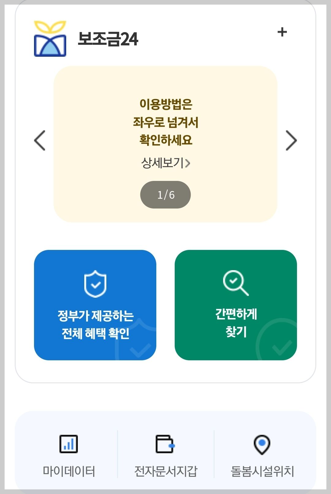 보조금24 서비스는 '정부24'에서 로그인 후 보조금24 이용 동의를 거치면 '나의 혜택'에서 바로 확인할 수 있고, 신분증을 들고 가까운 주민센터에 방문해 직접 보조금24 혜택을 확인할 수도 있으니 참고하세요.