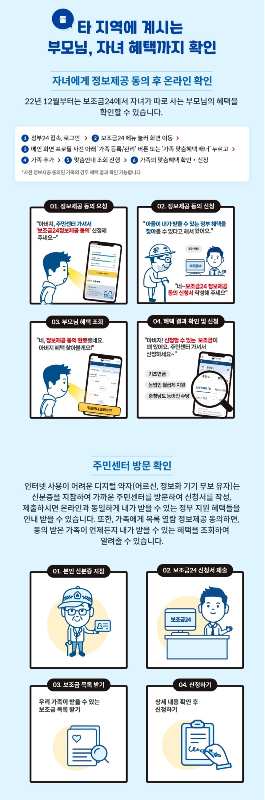 타 지역에 계시는 부모님과 자녀들의 혜택까지 확인할 수 있다고 하니 편리할 것 같습니다. 다만 부모님의 혜택을 확인하려면 신분증을 들고 부모님께서 동네 주민센터 가셔서 보조급24 정보제공 동의를 해주셔야 합니다.