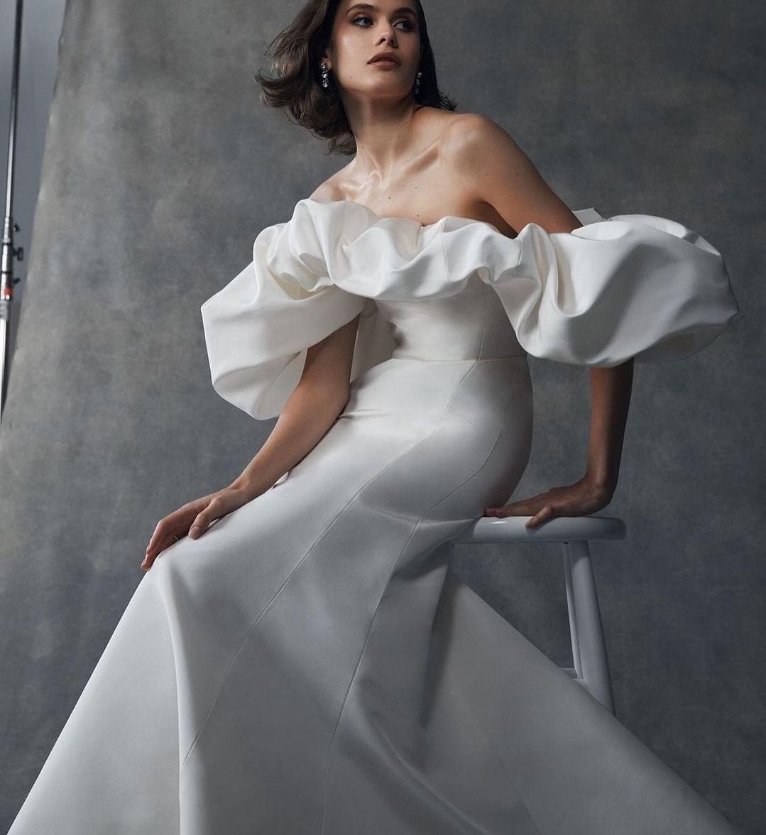 어깨선이 드러나는 오프숄더 네크라인의 실크드레스로, 풍성하게 볼륨을 살린 소매디자인이 유니크하면서도 여성스러움의 극치를 보여줍니다.