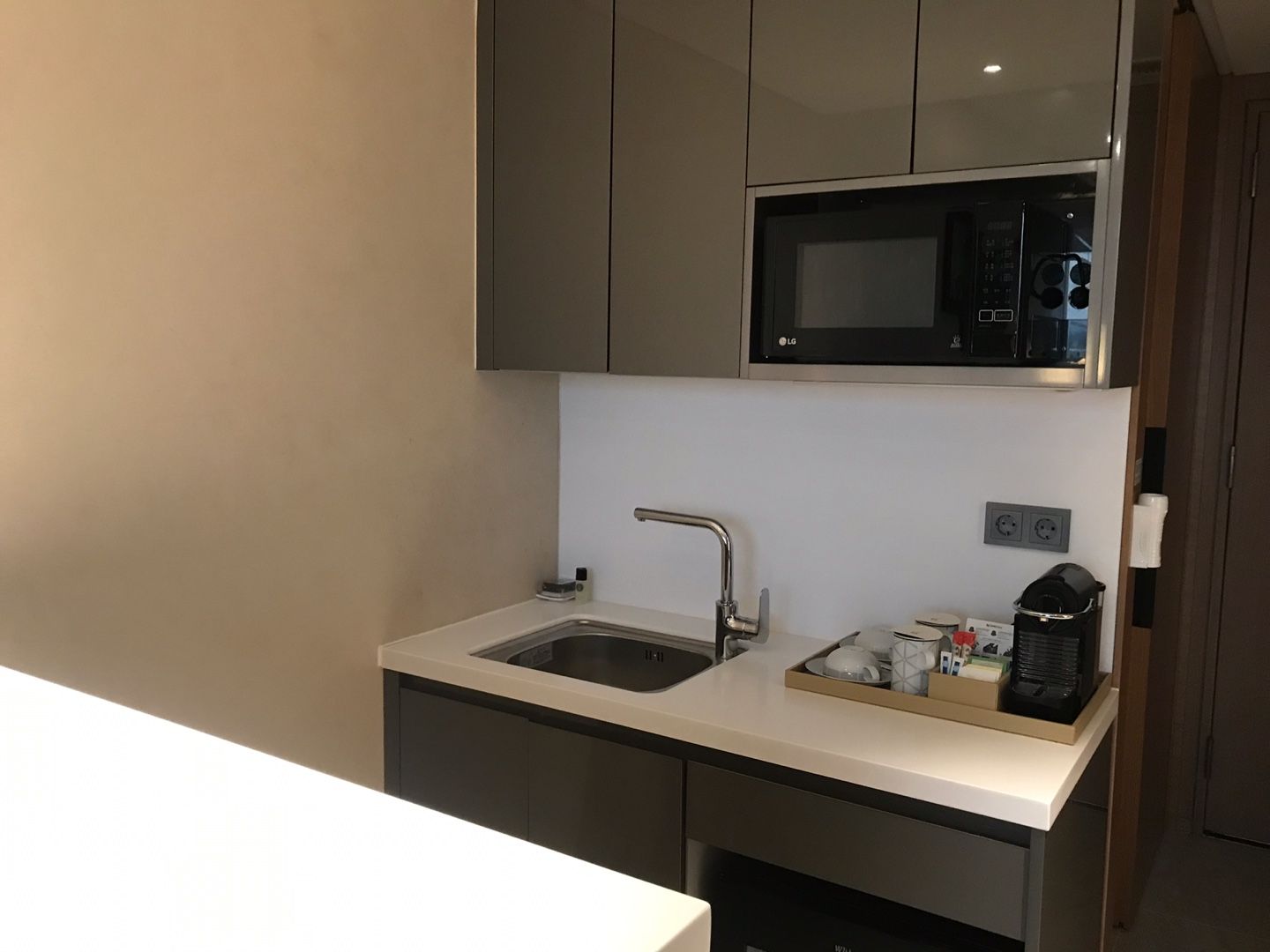 커피머신과 음료냉장고, 전자레인지가 있으며 아일랜드 식탁이 있어 편리했습니다.