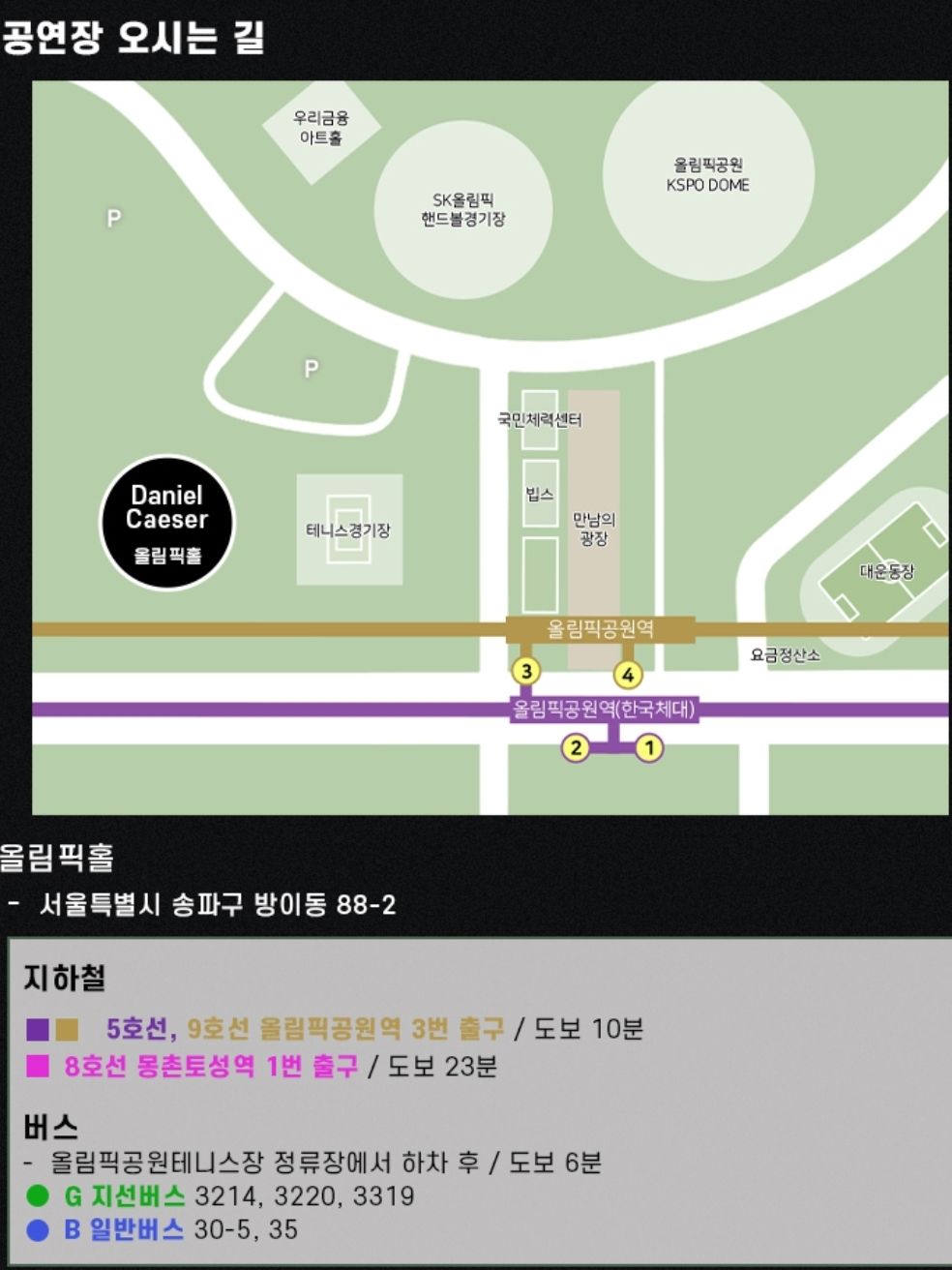 공연장인 올림픽공원 올림픽홀은 지하철 5호선, 9호선 올림픽공원역 3번 출구에서 도보 10분 거리,