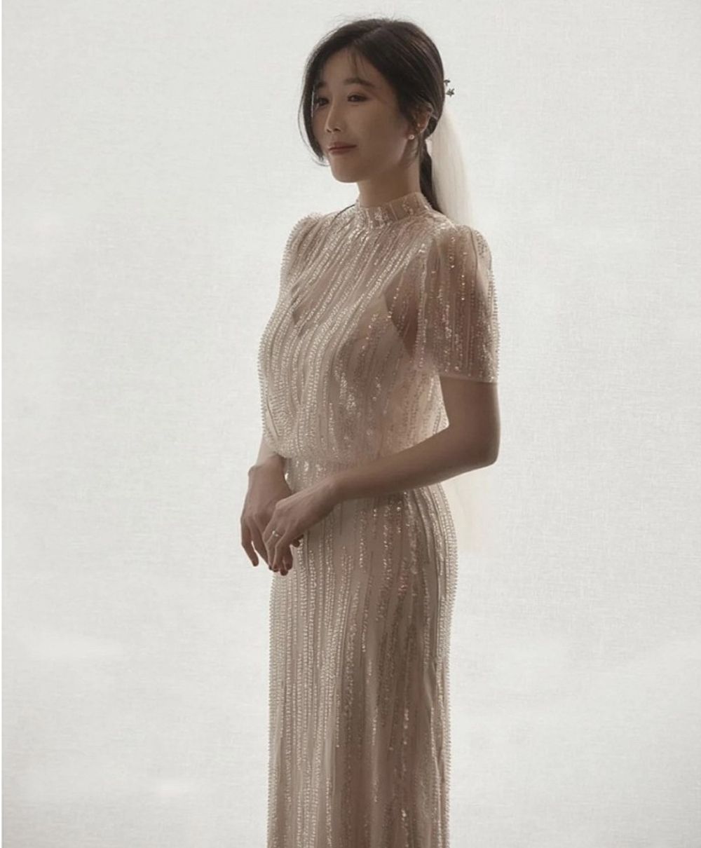 전체적으로 스팽글과 작은 비즈가 수놓아진 슬림한 라인의 드레스인데요, 길이도 길지 않아 요즘 세미웨딩이나 스몰웨딩하시는 신부님들이 선호하는 스타일입니다.