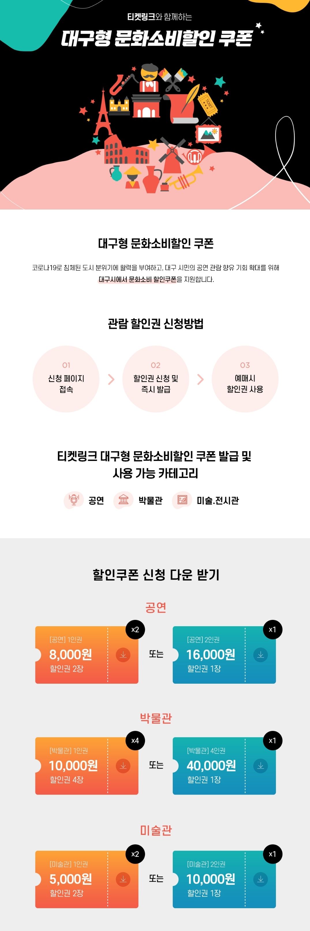 티켓링크에서 대구형 문화소비할인 쿠폰을 발급받아서 공연, 박물관, 미술관에서 예매시 사용가능합니다.