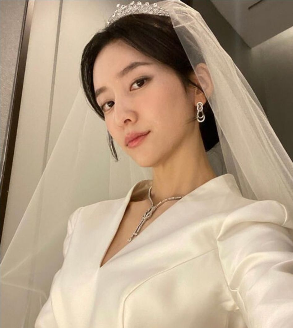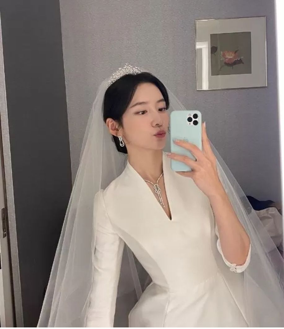 박지현드레스는 미카도실크로 만들어진 7부소매의 드레스였고 베일은 심플한 이중베일에 티아라로 클래식하게 마무리했습니다.