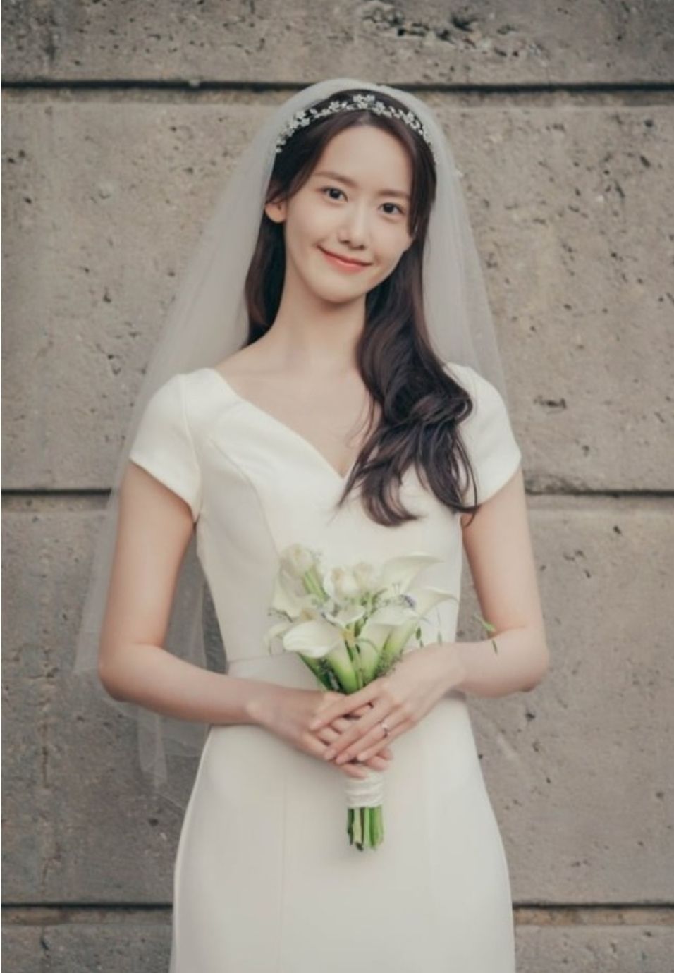 앞머리를 내린 단발머리 뱅헤어에 미디 길이의 베일과 함께 사랑스러운 신부의 모습이 연출되었습니다.