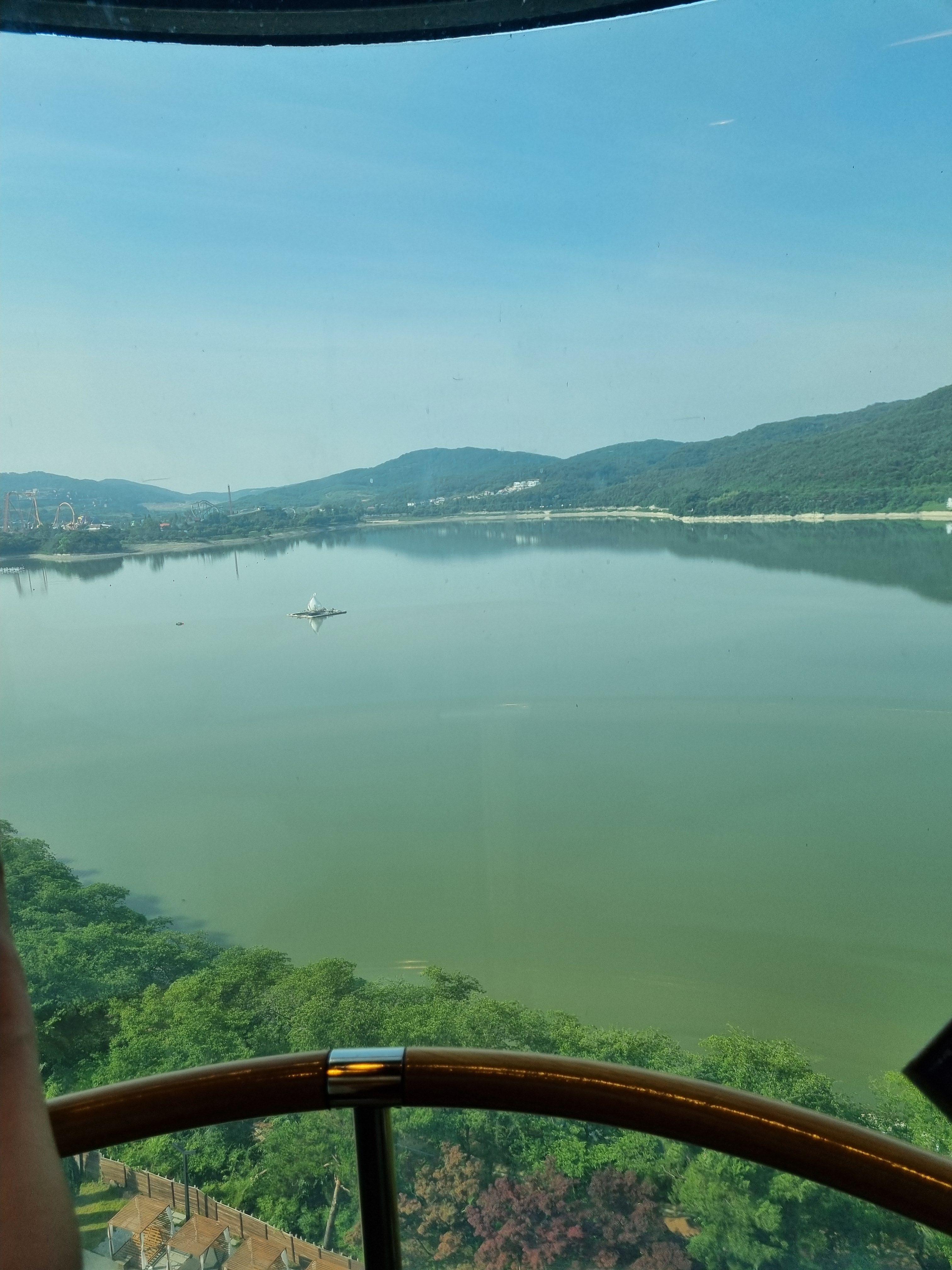 엘레베이터를 타고 내려가는데 엘레베이터 통창으로 보이는 호수.
