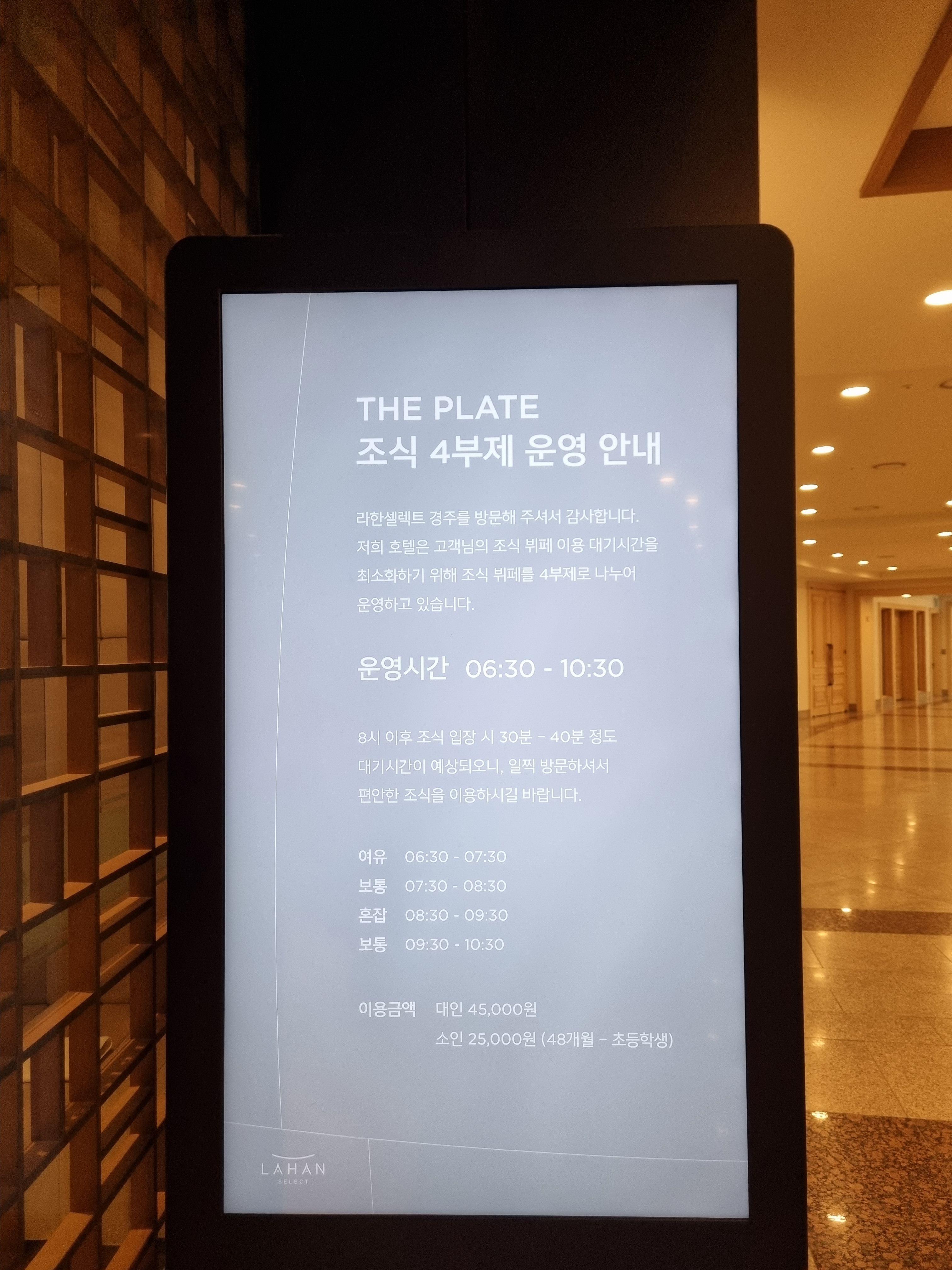 라한셀렉트 경주의 조식 뷔페는 호텔 지하 1층에 있는 '더 플레이트'에서 드실 수 있구요, 금, 토, 일요일은 석식뷔페도 운영한다고 합니다.
