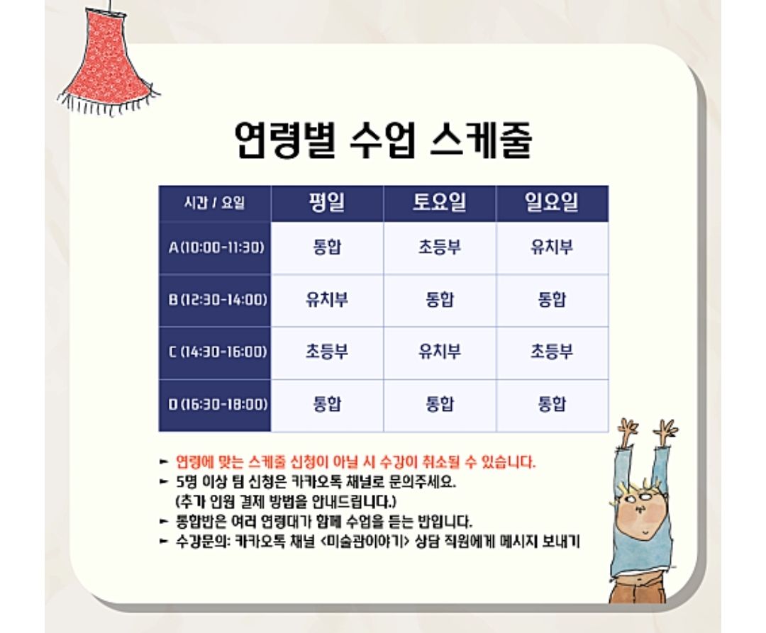 한 팀 정원은 기준 4명, 최대 5명이며 전시관 스토리텔링과 전시관 내에 위치한 아트 스튜디오에서 아트클래스를 진행한다고 합니다.