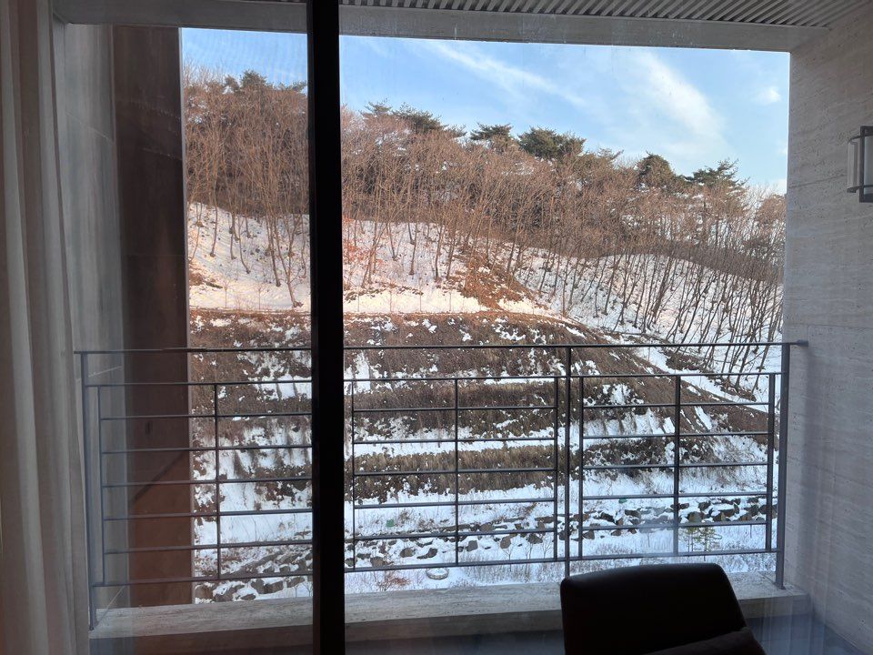 거실에서 보이는 숲뷰, 눈이 온 뒤라 예뻤어요.