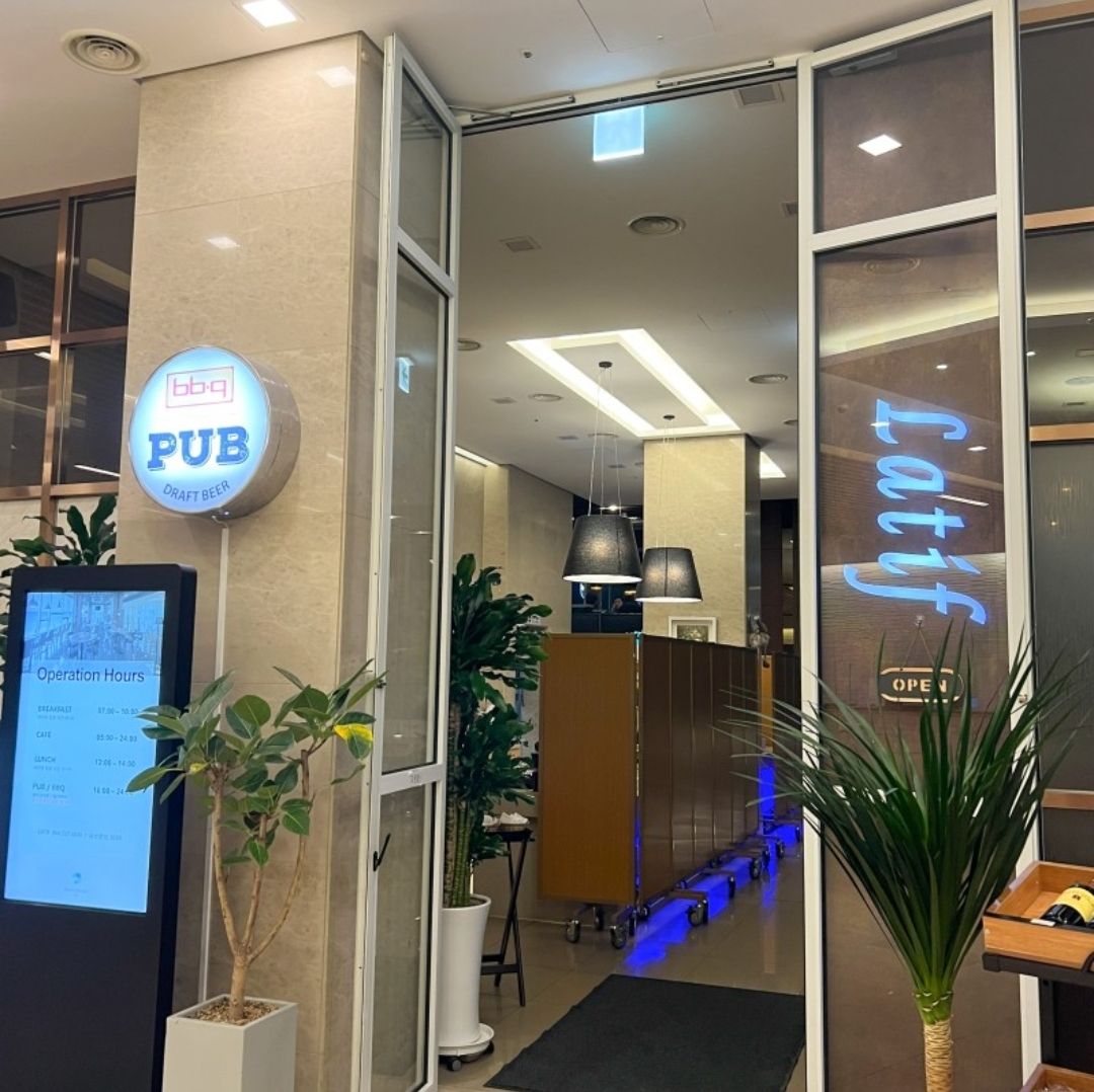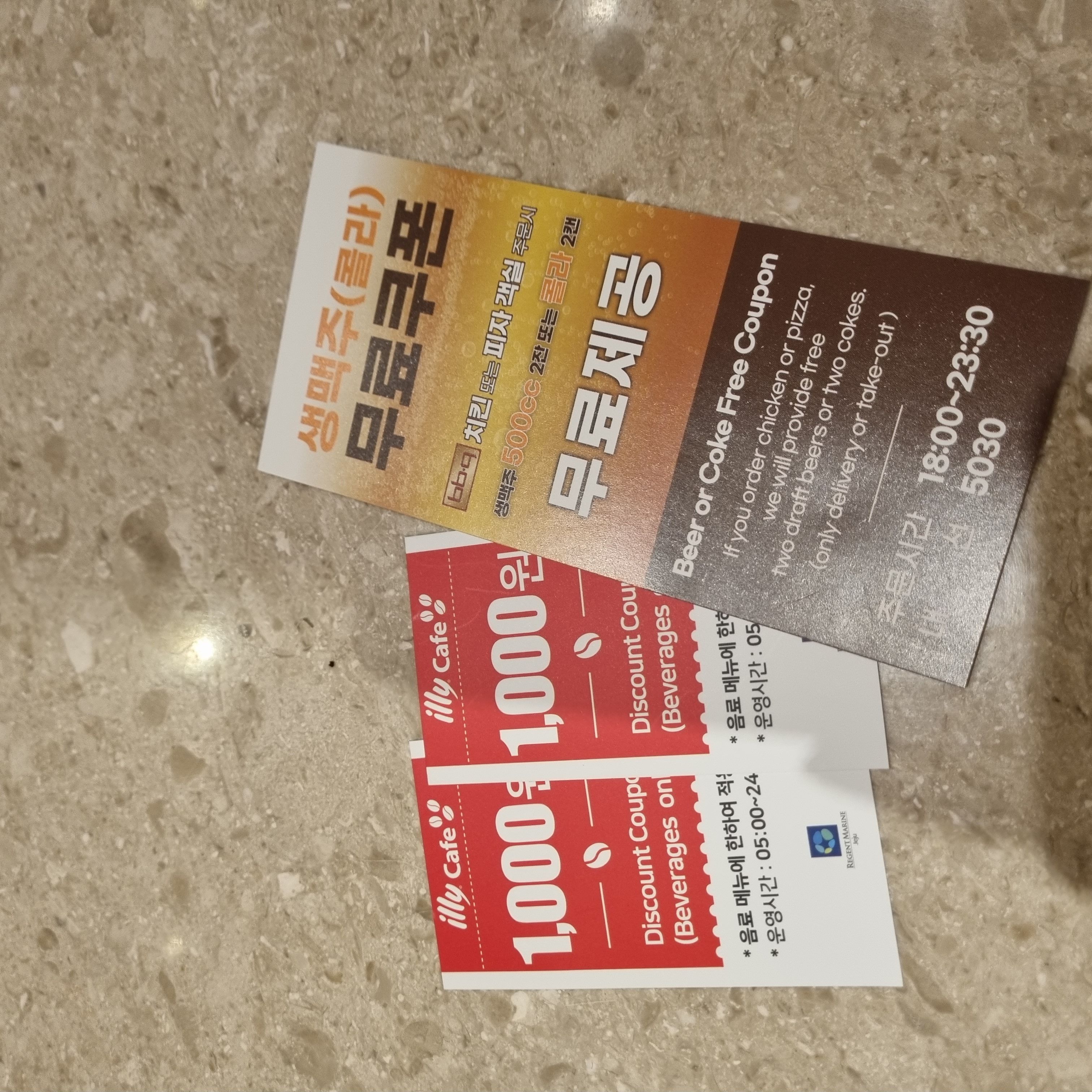 프론트에서 체크인할때 카드키와 함께 BBQ 맥주 무료쿠폰(또는 콜라)이랑 1층 일리커피 1,000원 할인권을 두장 주셨어요.