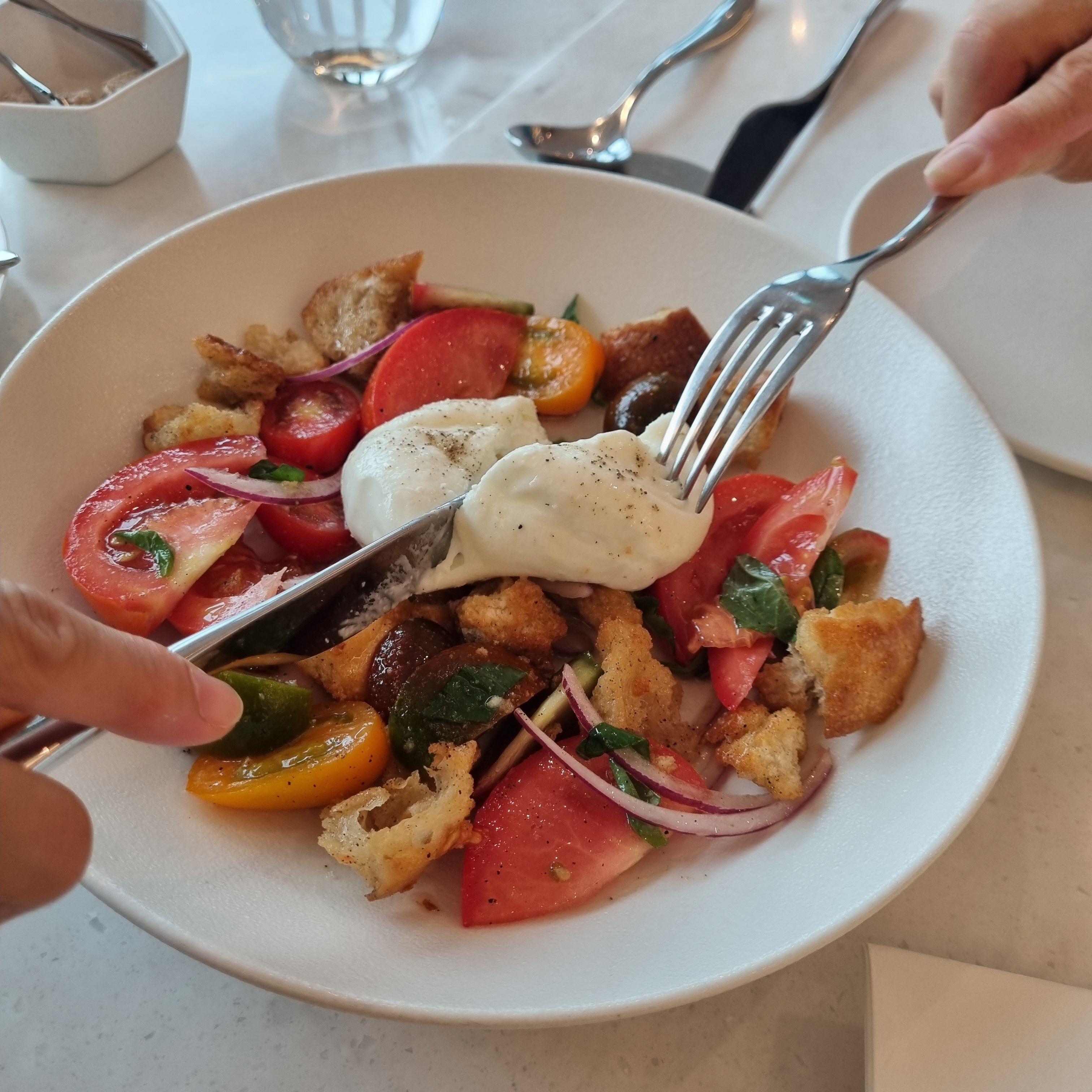바삭하게 튀겨진 크루통과 색색의 토마토, 고소한 부라타치즈의 조합은 정말 완벽했습니다.
