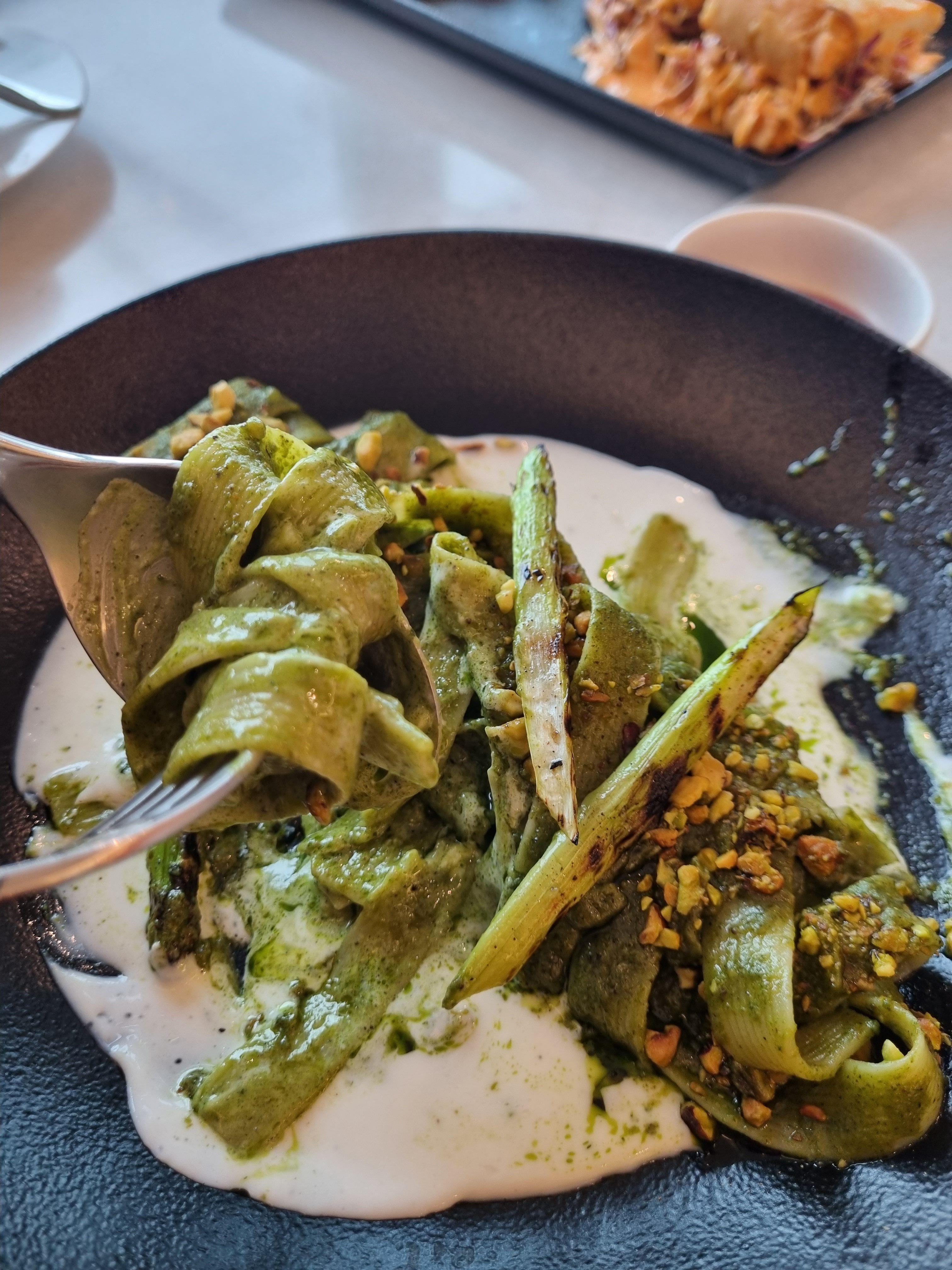 넙적한 파스타에 크림소스, 구운 아스파라거스, 피스타치오가 잔뜩 뿌려져서 나왔어요.