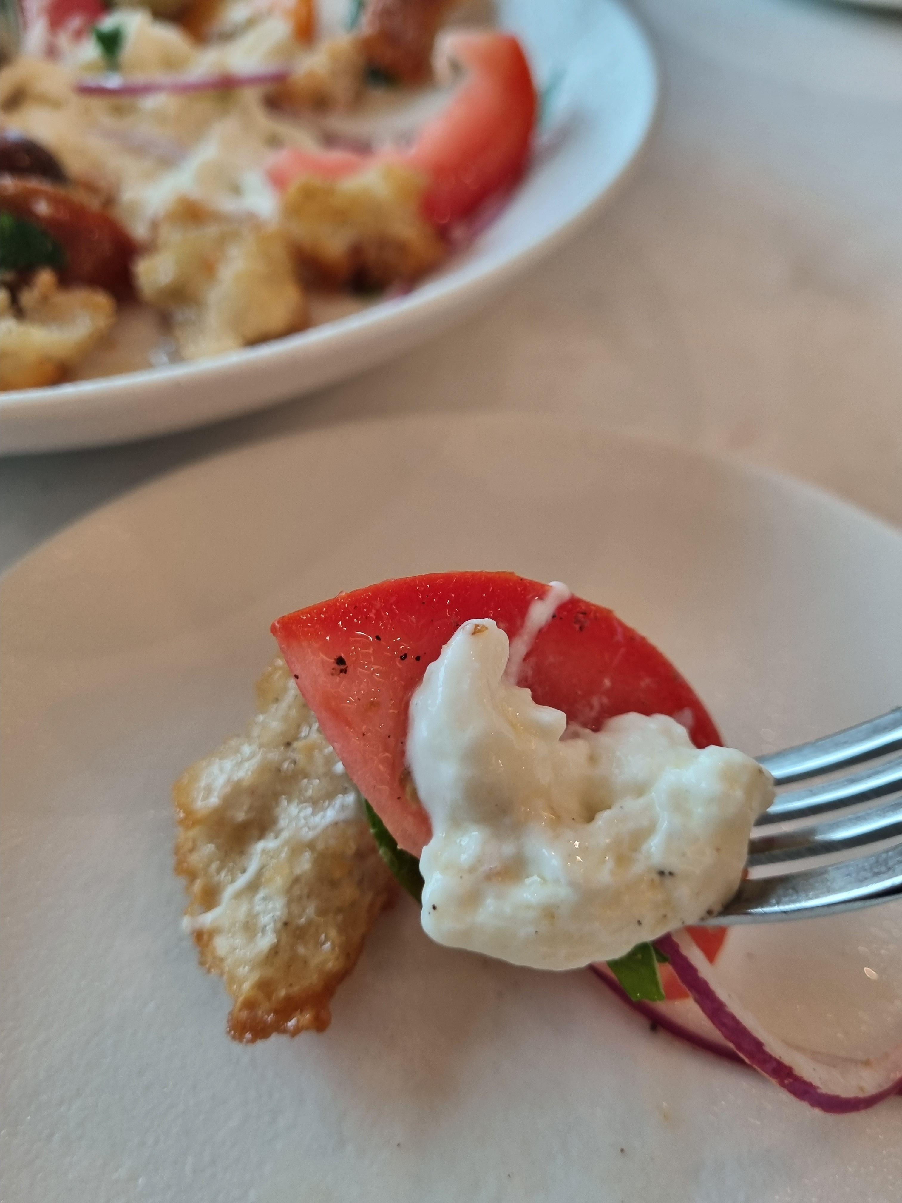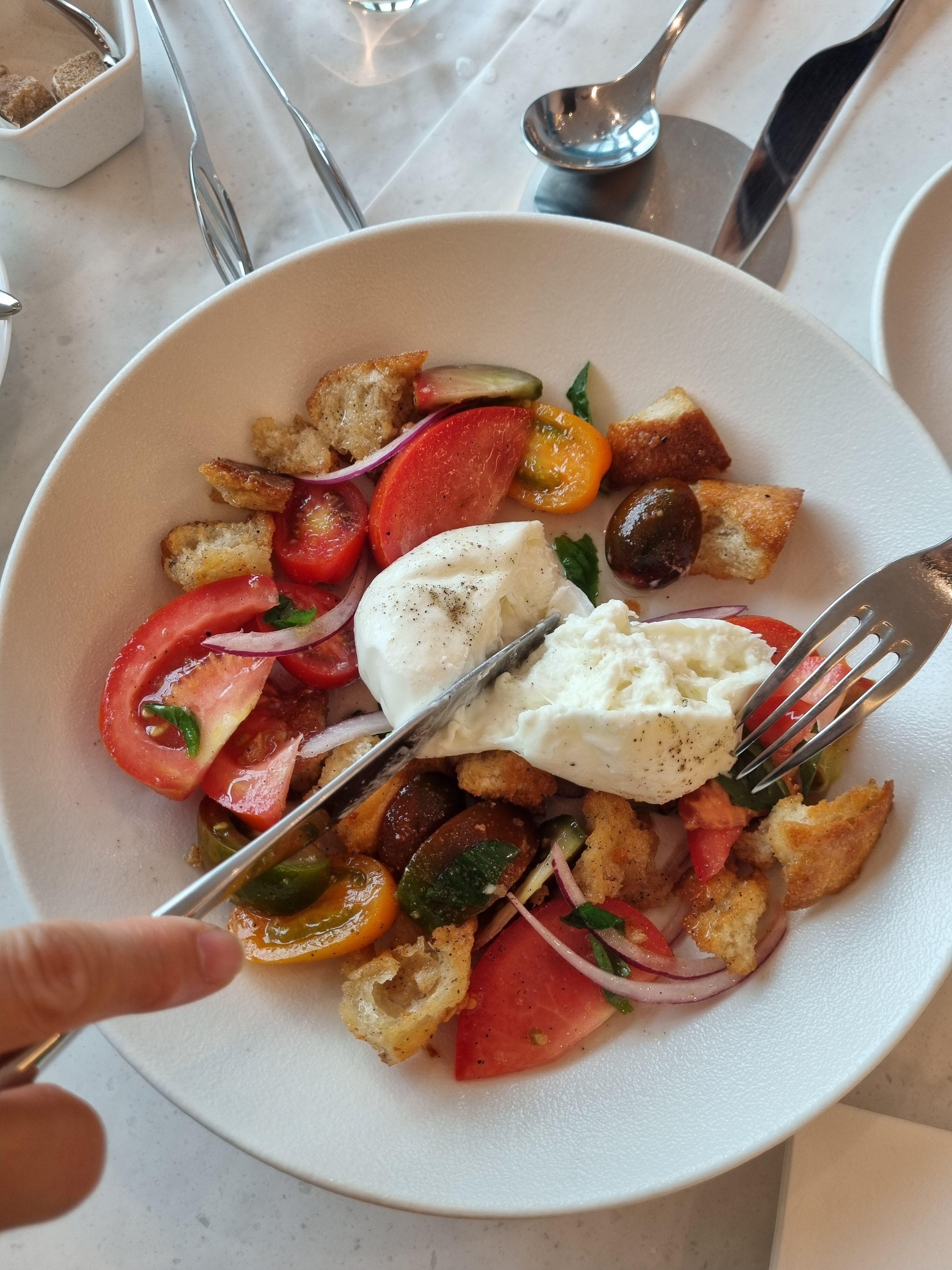 바삭하게 튀겨진 크루통과 색색의 토마토, 고소한 부라타치즈의 조합은 정말 완벽했습니다.