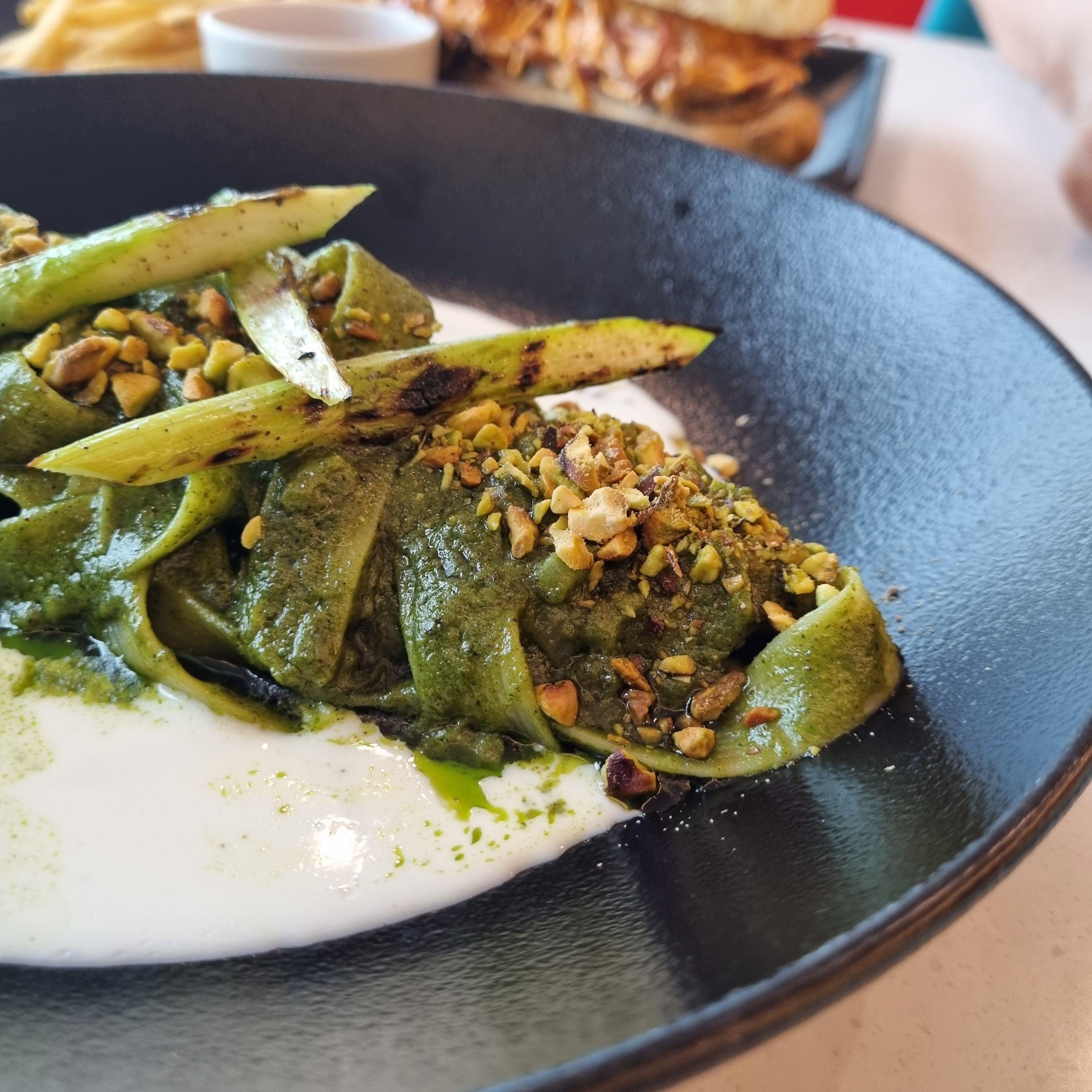 넙적한 파스타에 크림소스, 구운 아스파라거스, 피스타치오가 잔뜩 뿌려져서 나왔어요.
