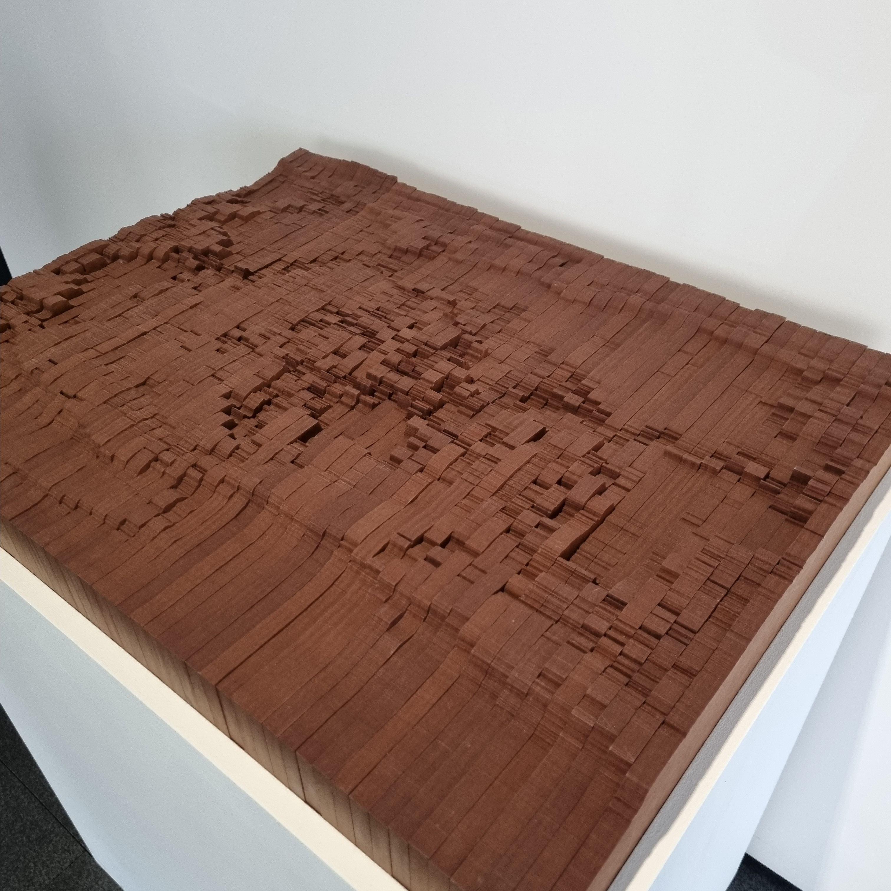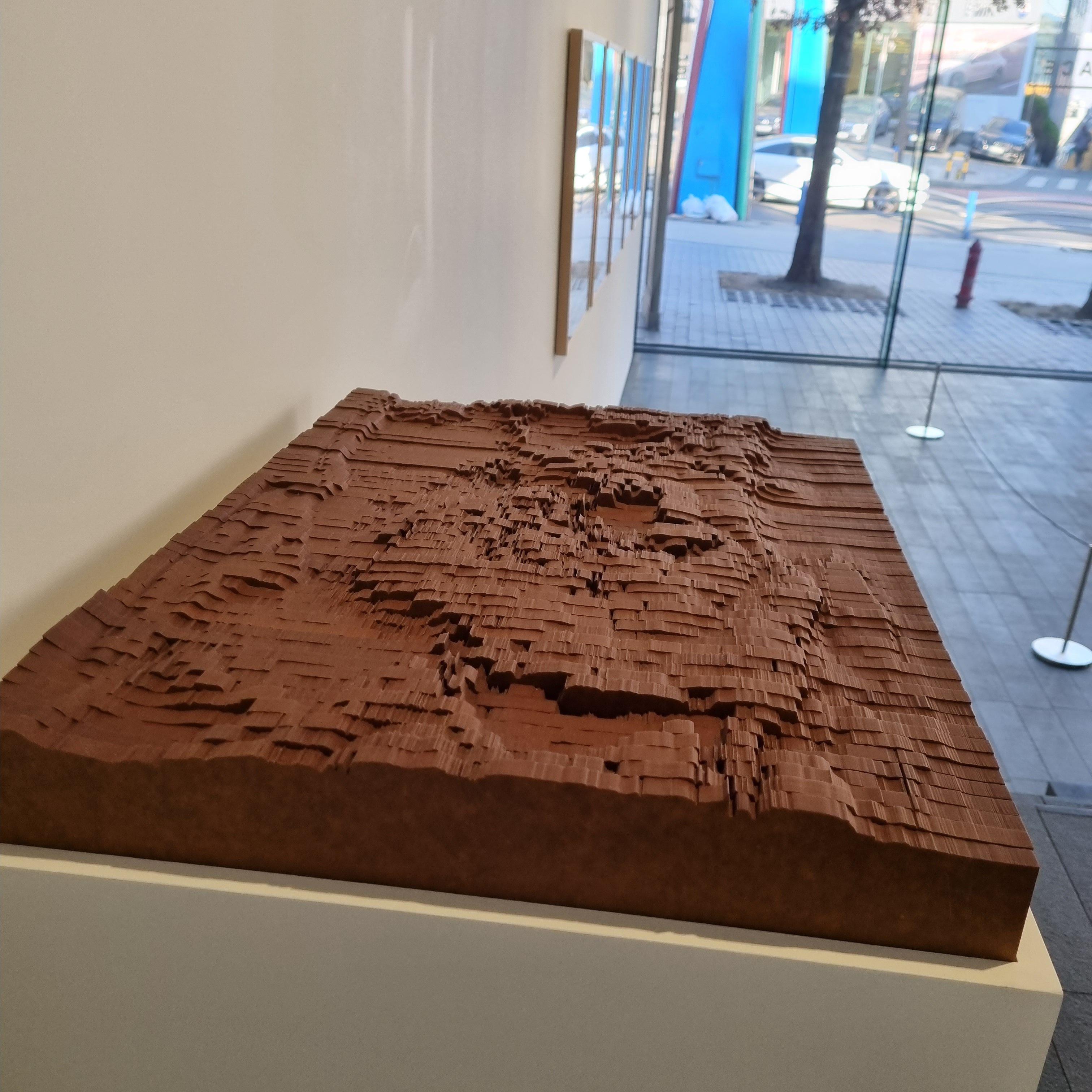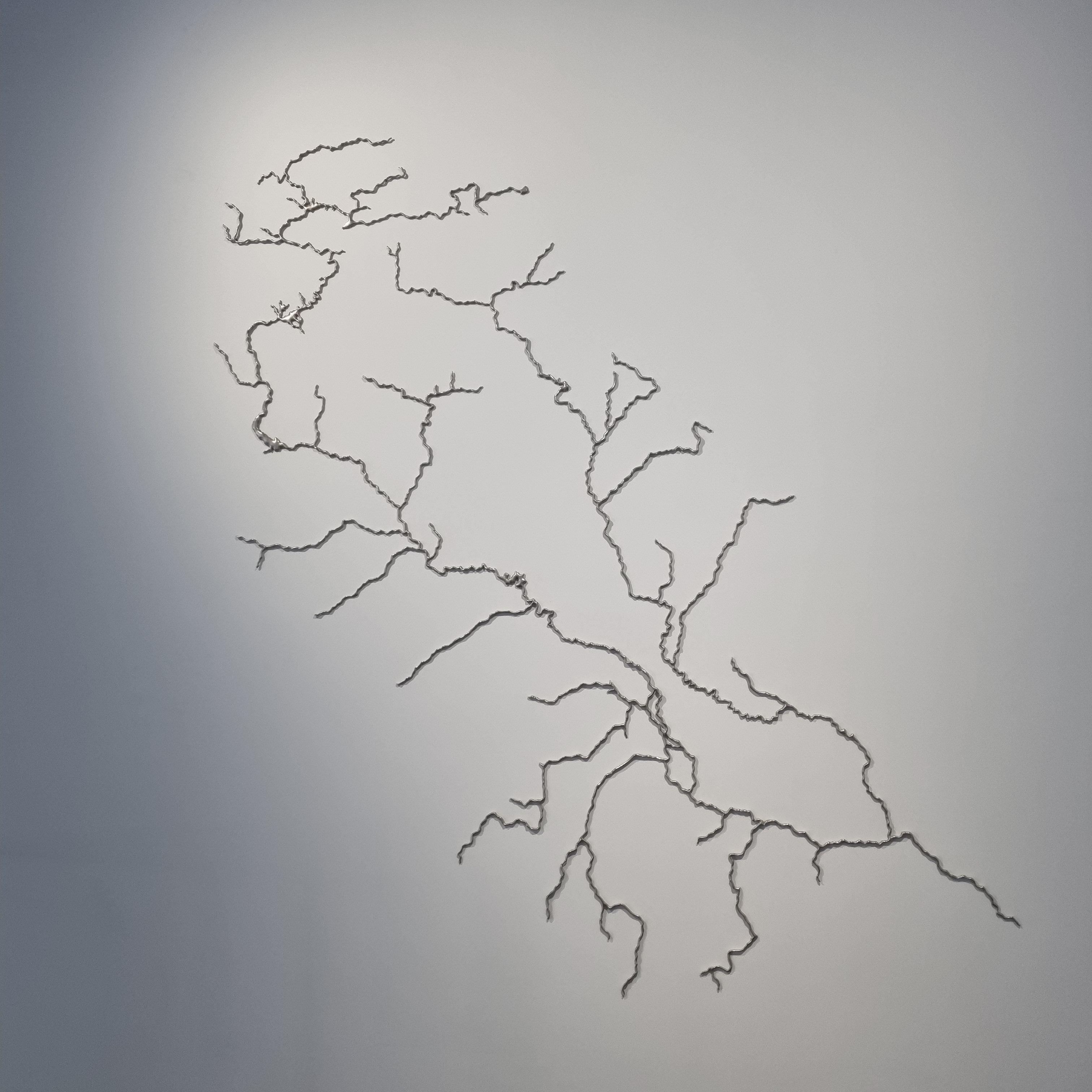 벽에 전시된 이 작품은 가까이서 보면 얇은 스테인레스 스틸 핀으로 촘촘히 꽂아서 한강 수로를 표현했고 물의 시각적, 질감적 특징을 담은 다른 작품이 하나 더 있는데