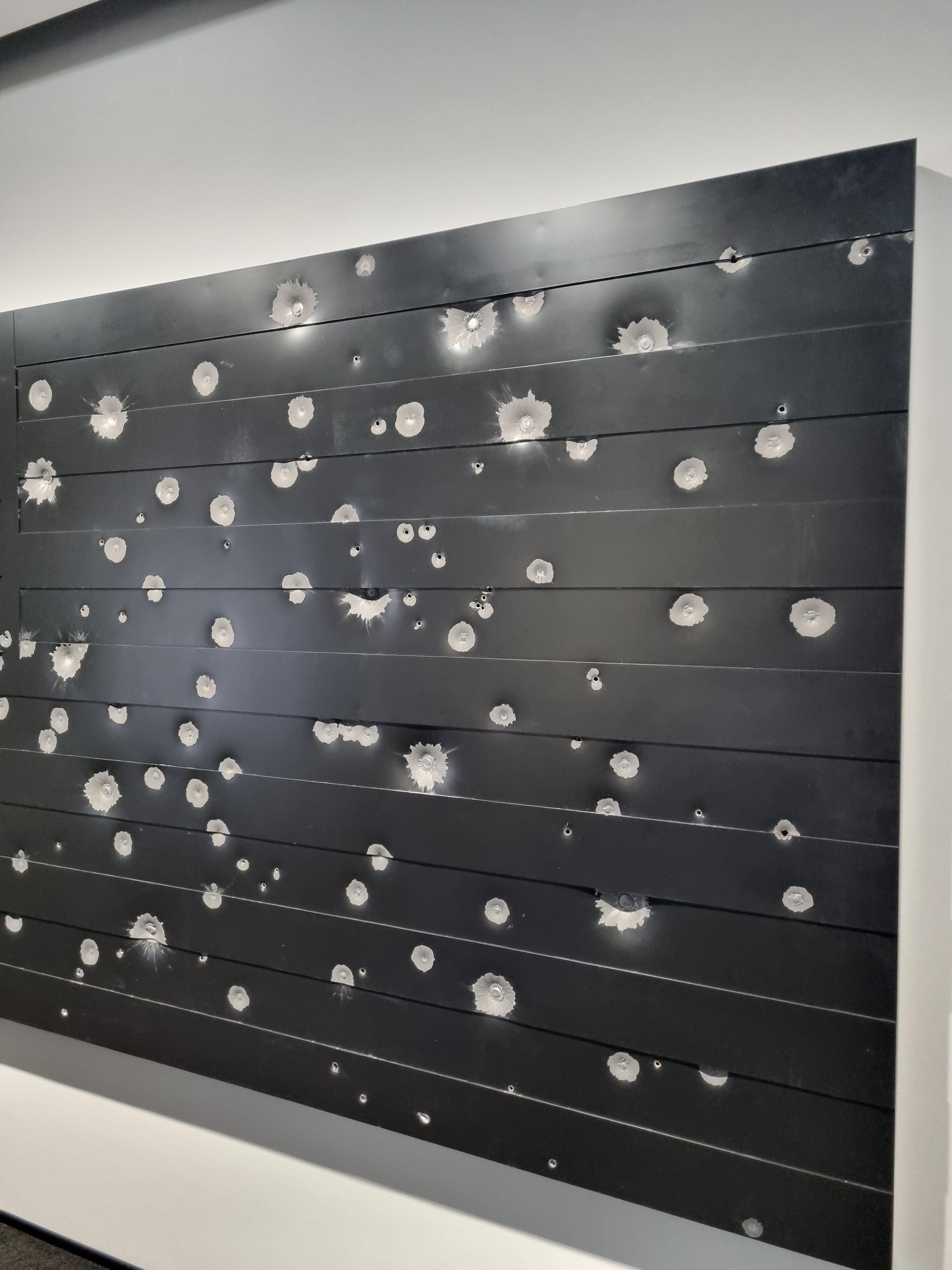 검은 철판에 군데군데 총탄 자국이 있는 이 작품은 미국 성조기를 검게 새기고 실탄을 발사하여 완성된 것이라고 합니다.