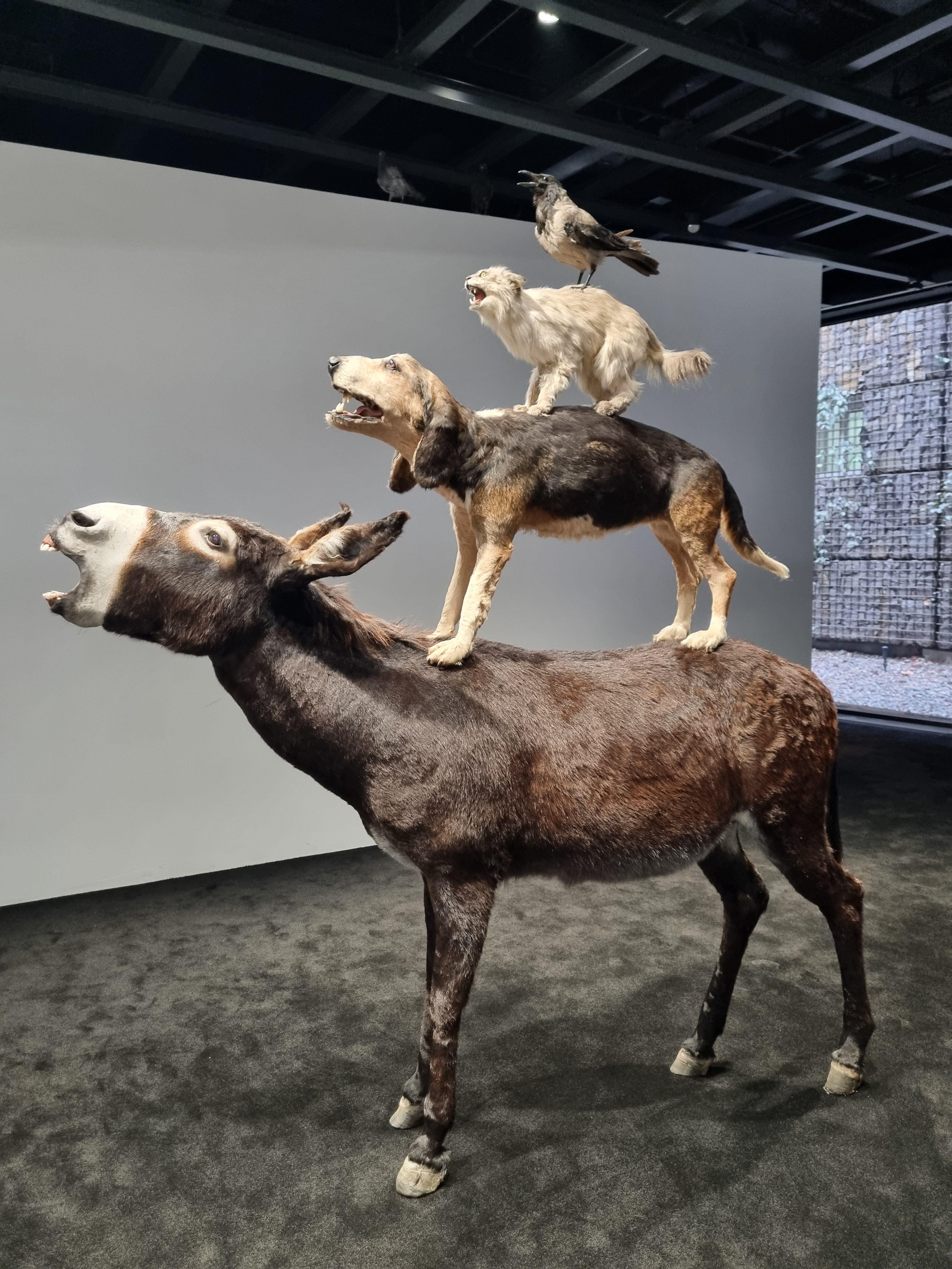 늙은 당나귀, 개, 고양이, 수탉 순으로 올라가있는 이 작품은 전시장 반대편에 박제 동물로 만들어놓은 <가족>이라는 작품과 같은 구성입니다.