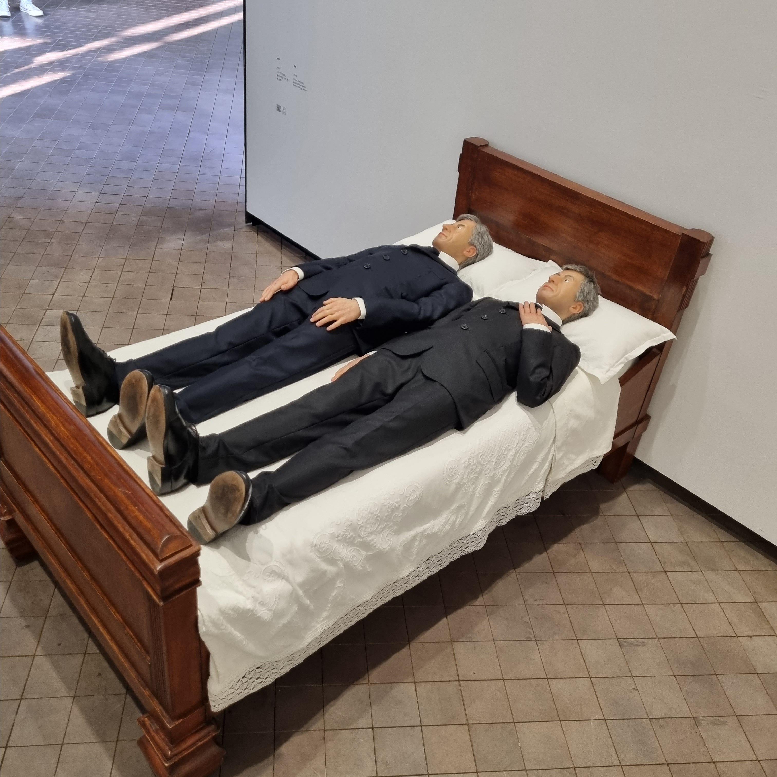 카텔란 자신을 닮은 두 남자 형상의 인형이 침대에 누워있습니다.