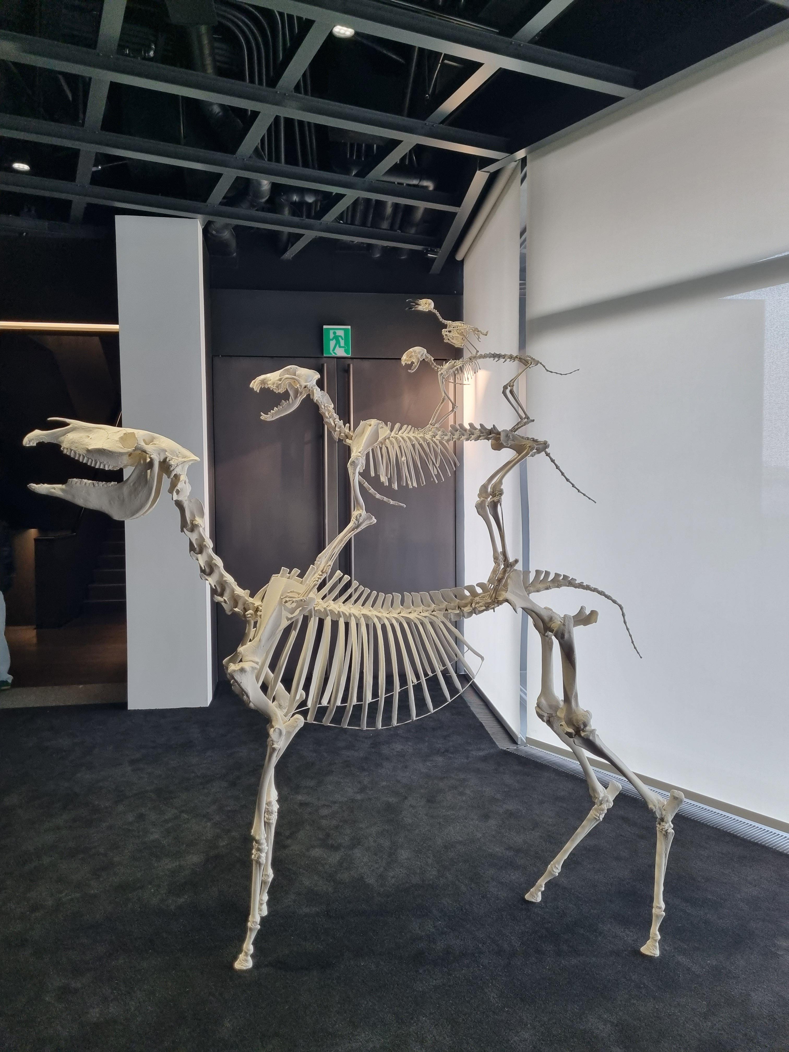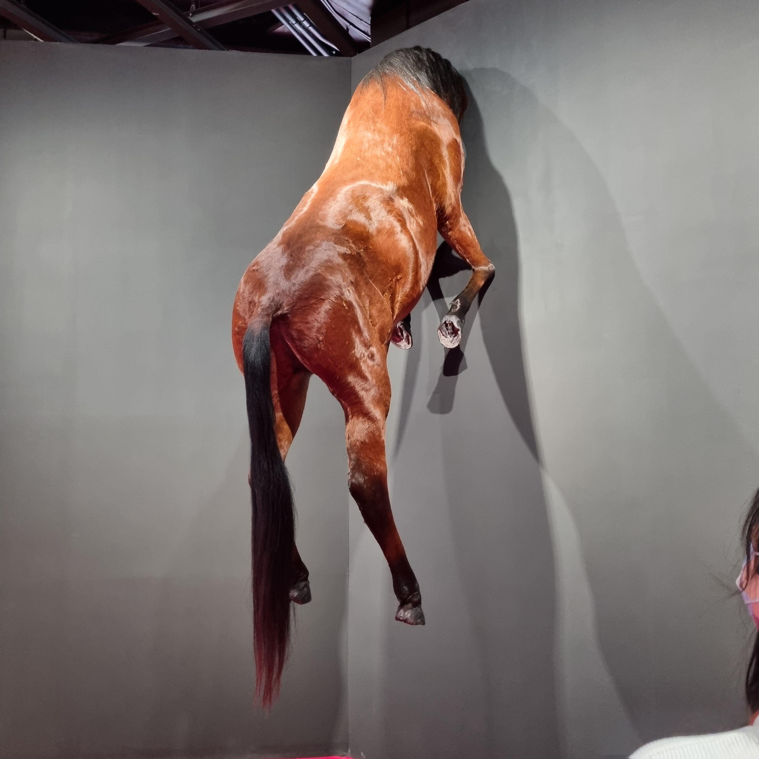 사냥감의 머리를 벽에 박제하는 것과 반대로 머리를 제외한 말의 몸통만 벽에 걸려있는 작품.