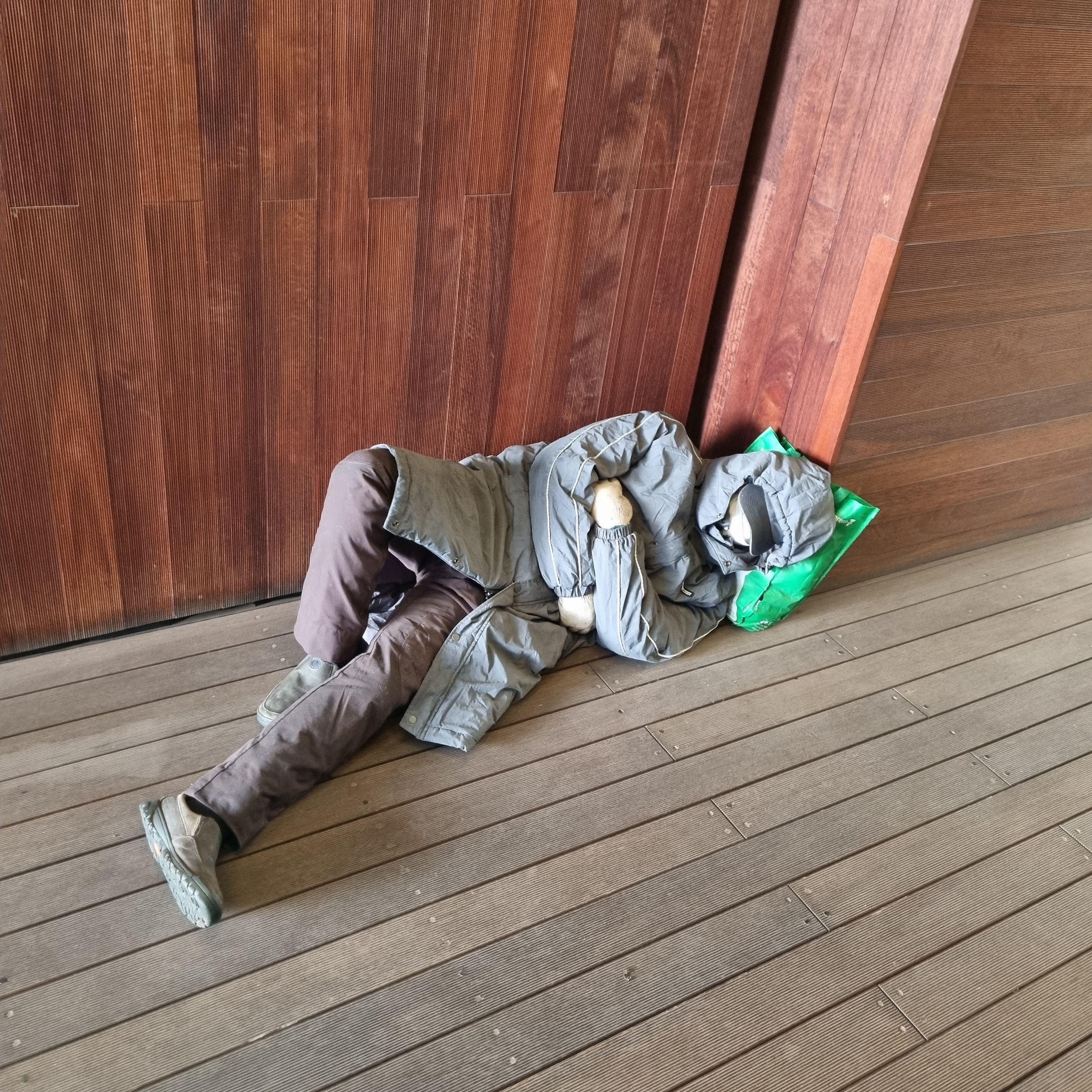 그래도 여기 노숙자는 문밖에 누워있는 분보다 그래도 상황이 좀 나아보이네요.