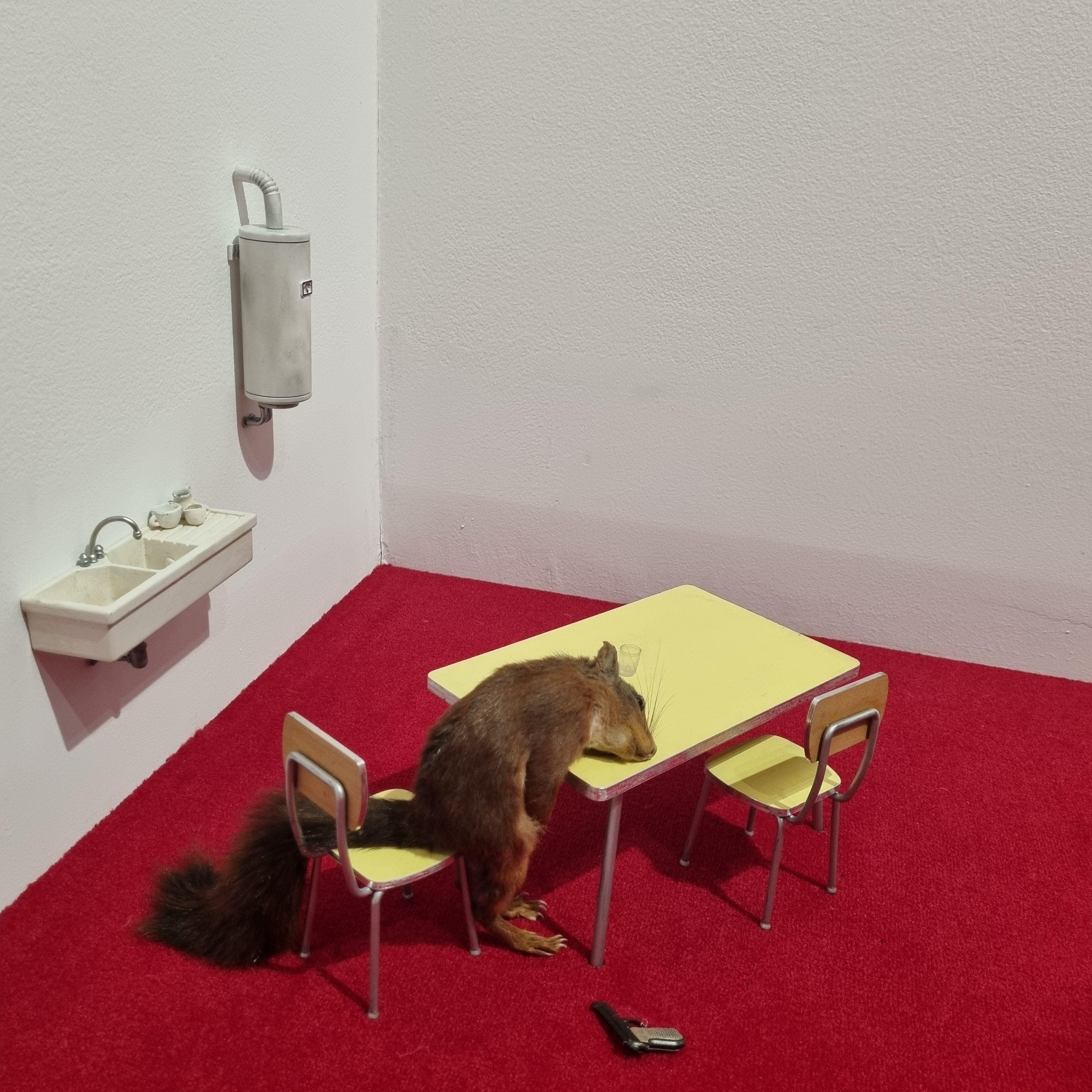 테이블에 축 늘어진 다람쥐의 자세와 씽크대에 쌓인 접시, 발치에 놓인 총을 통해 다람쥐가 스스로 목숨을 끊었다는 것을 알 수 있는 비극적인 작품입니다.