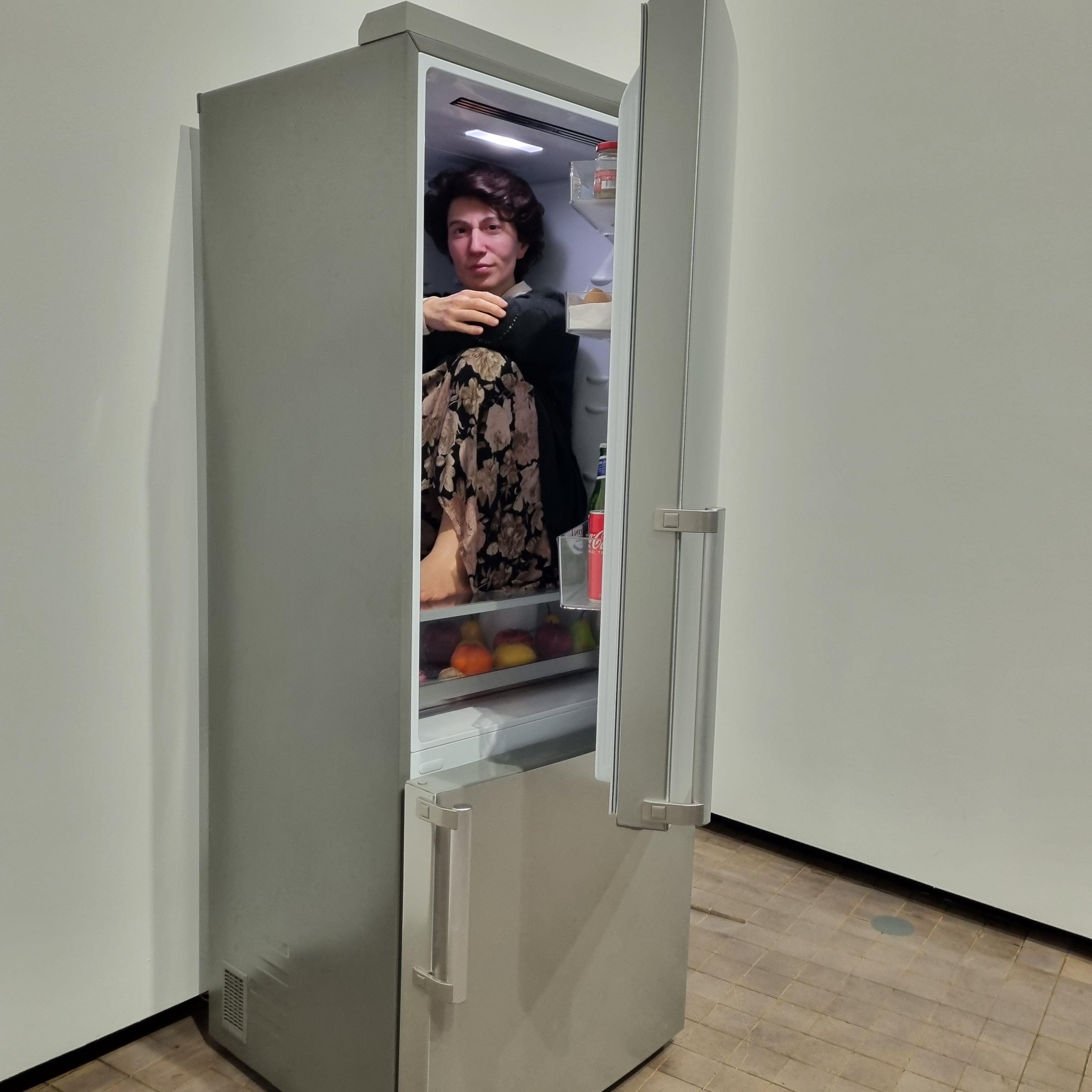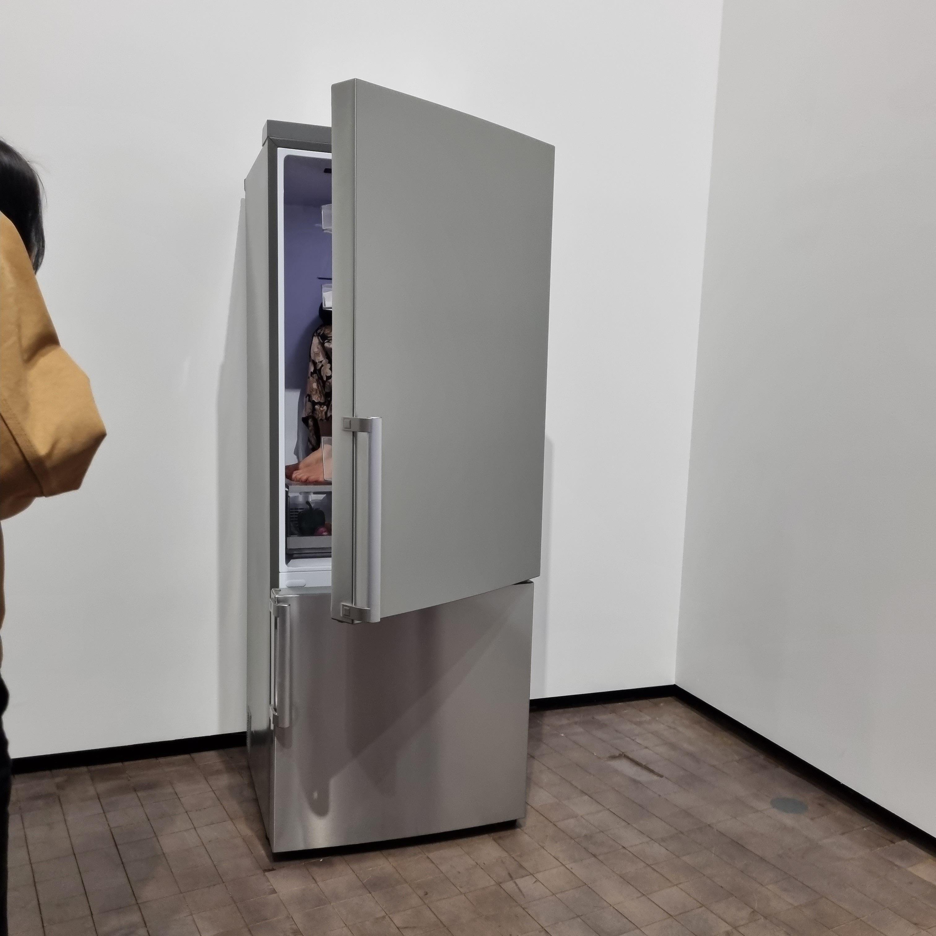 아래 냉장고안에 중년의 여성이 들어가 앉아있습니다.