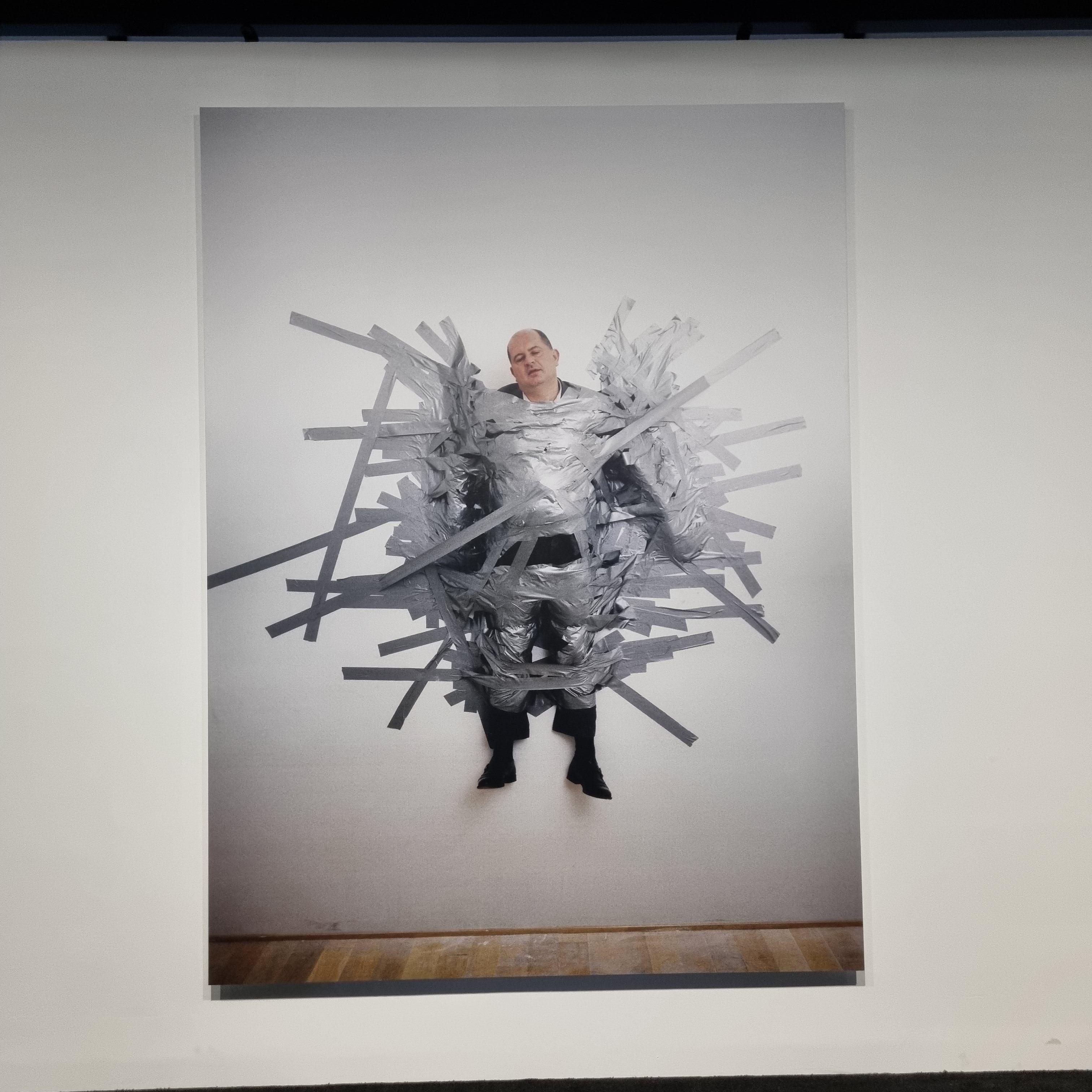 마우리치오 카텔란은 자신의 작품 거래를 담당한 갤러리스트를 덕테이프로 벽에 붙였고, 그것을 사진으로 찍은 작품.